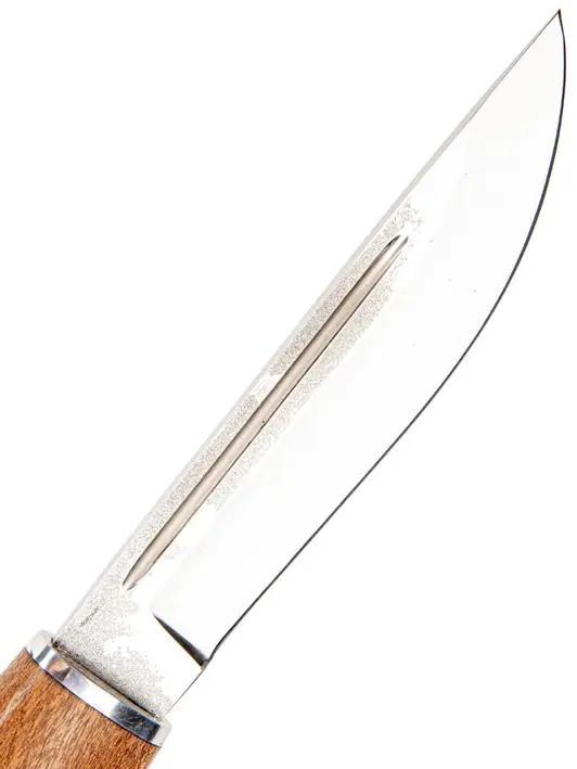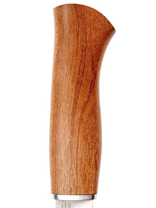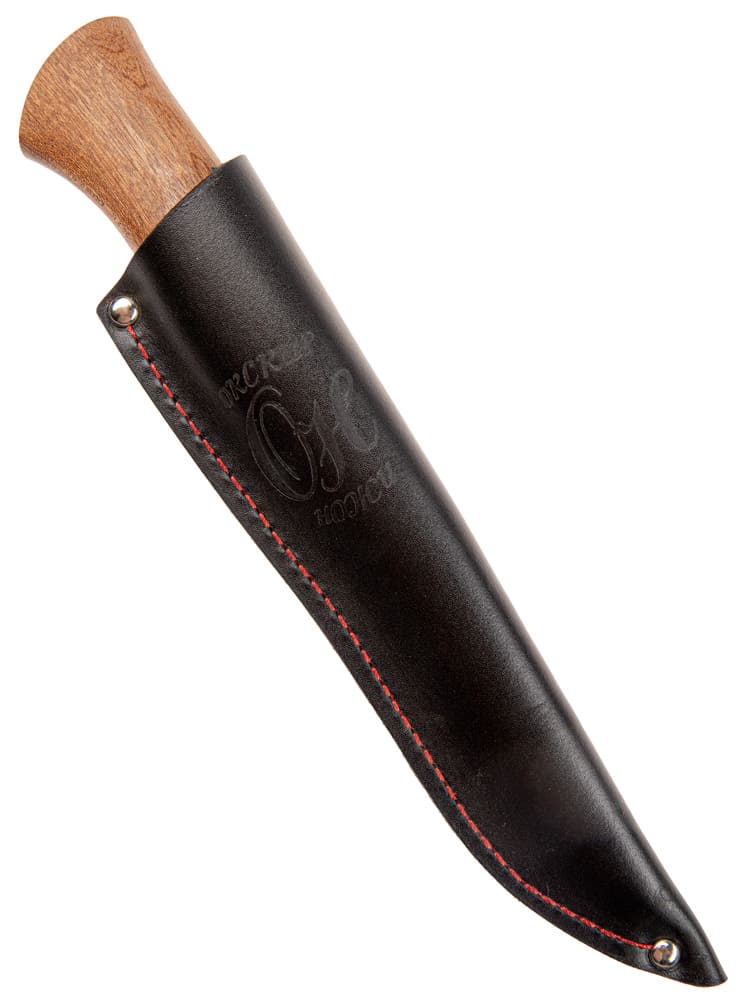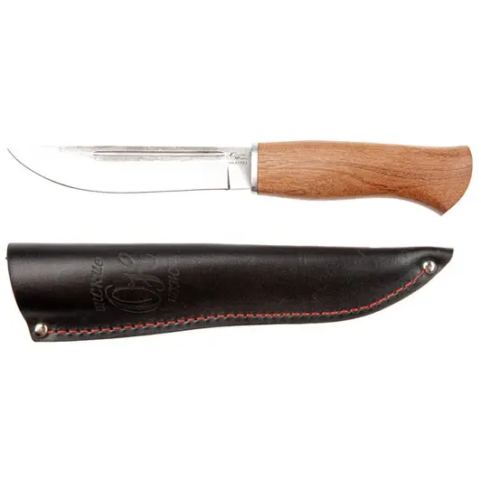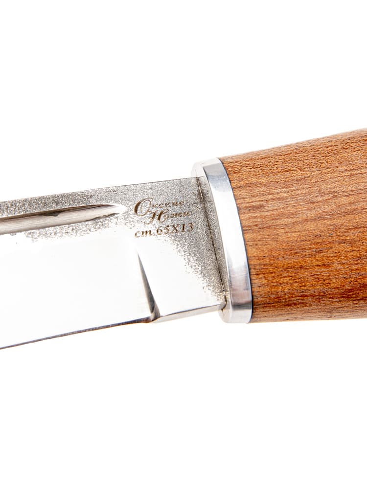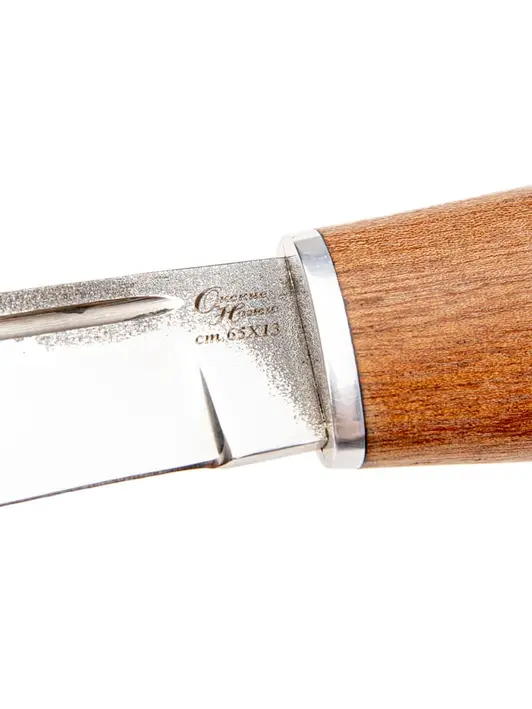 Финский нож малого размера из нержавеющей стали 65Х13 с клинком классической скандинавской формы, рукоять выполнена из благородного дерева сапели с накладками из дюралюминия. Нож имеет традиционные «скандинавские» спуски в ноль без подводов, обеспечивающие отличный рез. Общая длина ножа составляет около 200 мм, длина клинка — 60–100 мм, толщина обуха — 2,4 мм. Нож предназначен для универсального применения в походных условиях, на охоте и рыбалке, комплектуется кожаными ножнами, соответствует требованиям ГОСТ для разделочных ножей