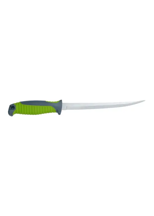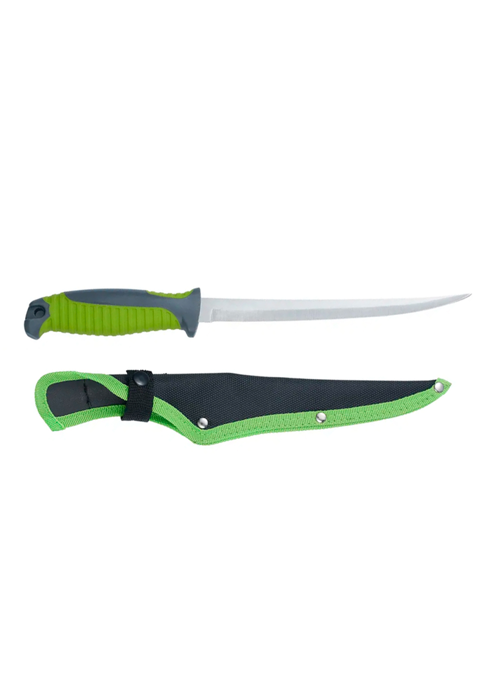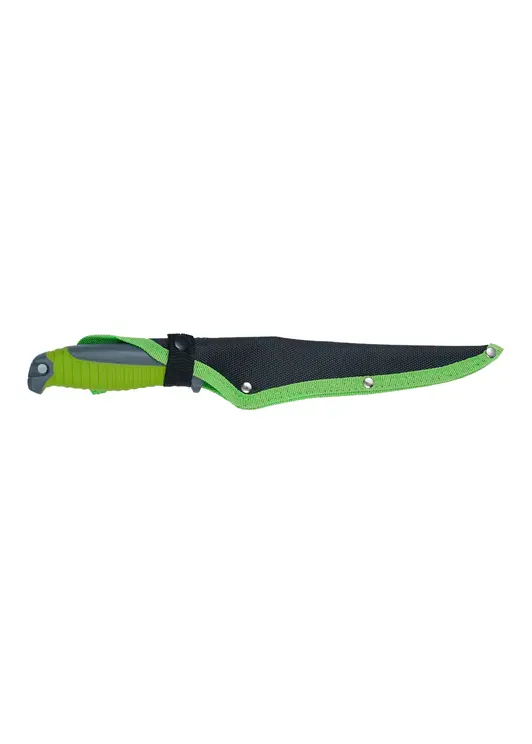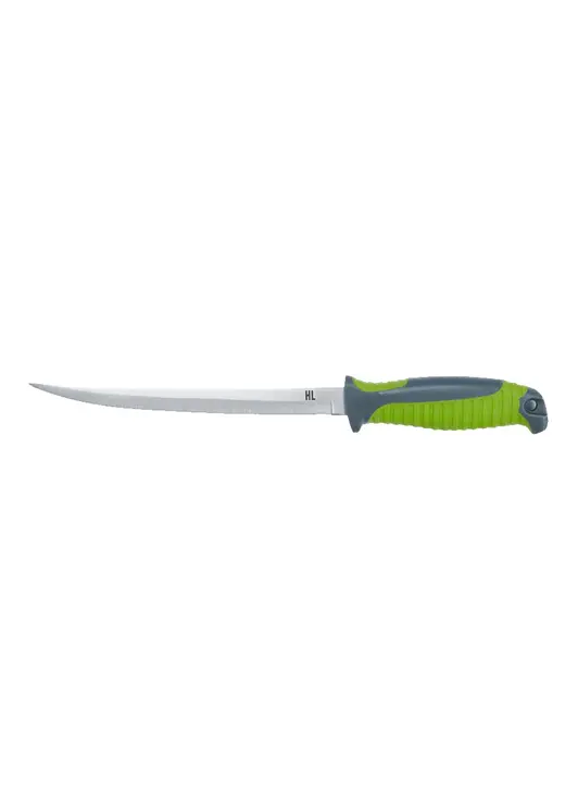 Нож HL Fillet Green+Grey с клинком длиной 20,2 см — отличный выбор для охотников и рыбаков. Он имеет общую длину 32,5 см и рукоять с прорезиненными элементами для надёжного и комфортного хвата. Клинок изготовлен из нержавеющей стали 420J2 японского производства, которая обладает антикоррозионными свойствами и легко затачивается в полевых условиях. В комплекте идут практичные и стильные нейлоновые ножны с застёжкой.