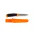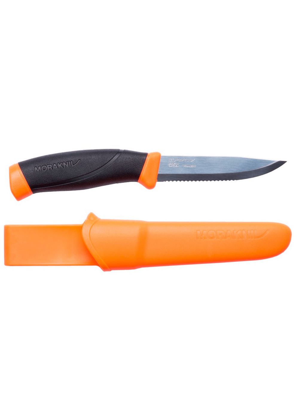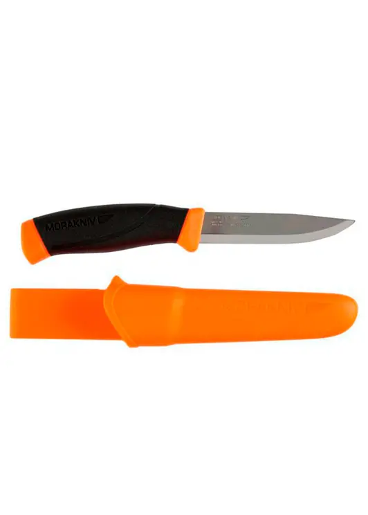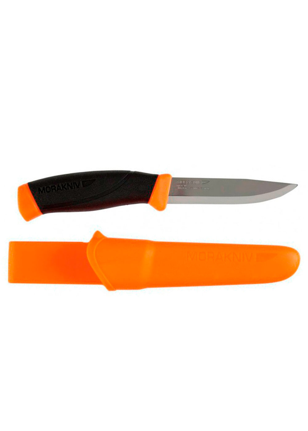 Эргономичная рукоять изготовлена из прорезиненного пластика с ярко-оранжевыми вставками, что позволит найти нож даже в ворохе листвы. На поверхности рукояти имеются насечки и тиснение в форме надписи Morakniv, что способствует надежному контакту с рукой. По традиции модель укомплектована пластиковыми ножнами оранжевого цвета, имеющими специальное крепление для размещения на поясе.