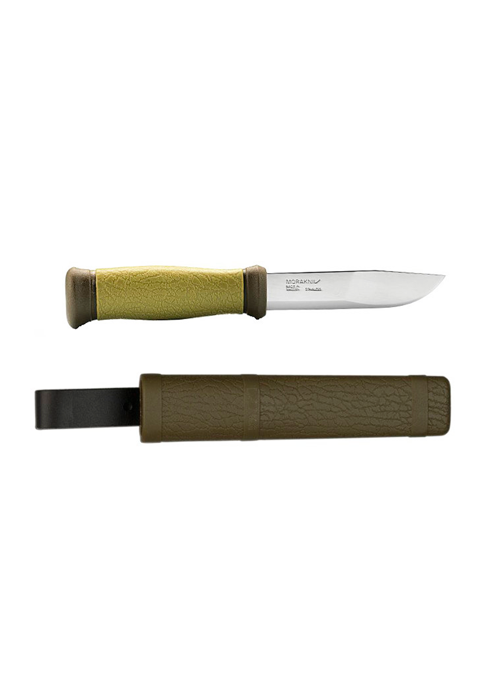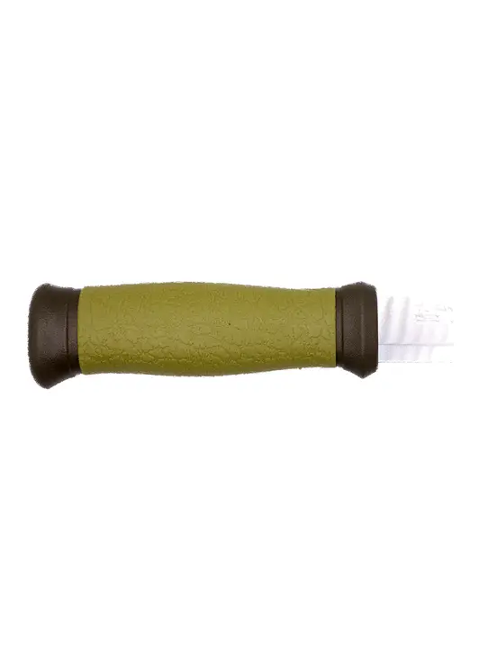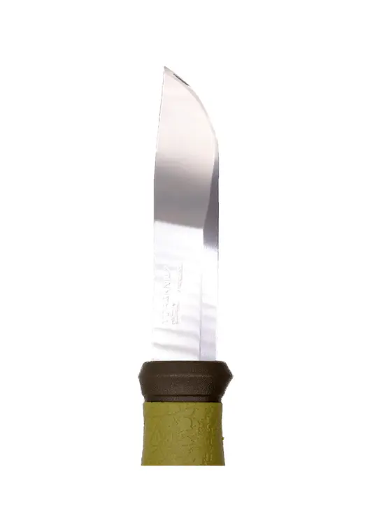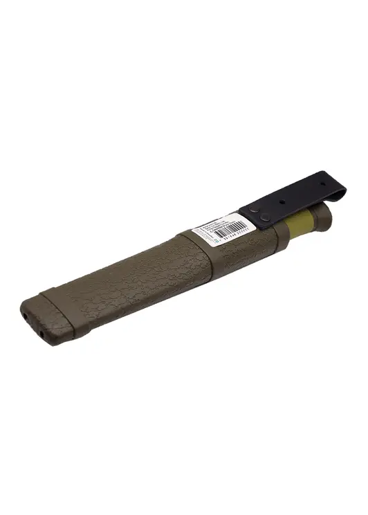 Morakniv Outdoor 2000 — универсальный туристический нож шведского производства с клинком из высококачественной нержавеющей стали Sandvik 12C27 твёрдостью 58–60 HRC. Клинок длиной 109 мм имеет особую геометрию с уменьшающейся толщиной от середины и скандинавскую заточку с углом около 19 градусов, что обеспечивает отличные режущие свойства. Рукоять выполнена из литого пластика с прорезиненным покрытием зелёного цвета, обеспечивающего надёжный хват даже влажными руками. Нож комплектуется прочными пластиковыми ножнами с дренажными отверстиями и кожаной петлёй для крепления на поясе. Общая длина — 225 мм, вес — 116 г. Модель универсальна в применении: подходит для резки, разделки, строгания и других работ, станет надёжным помощником для туристов, охотников и рыбаков