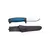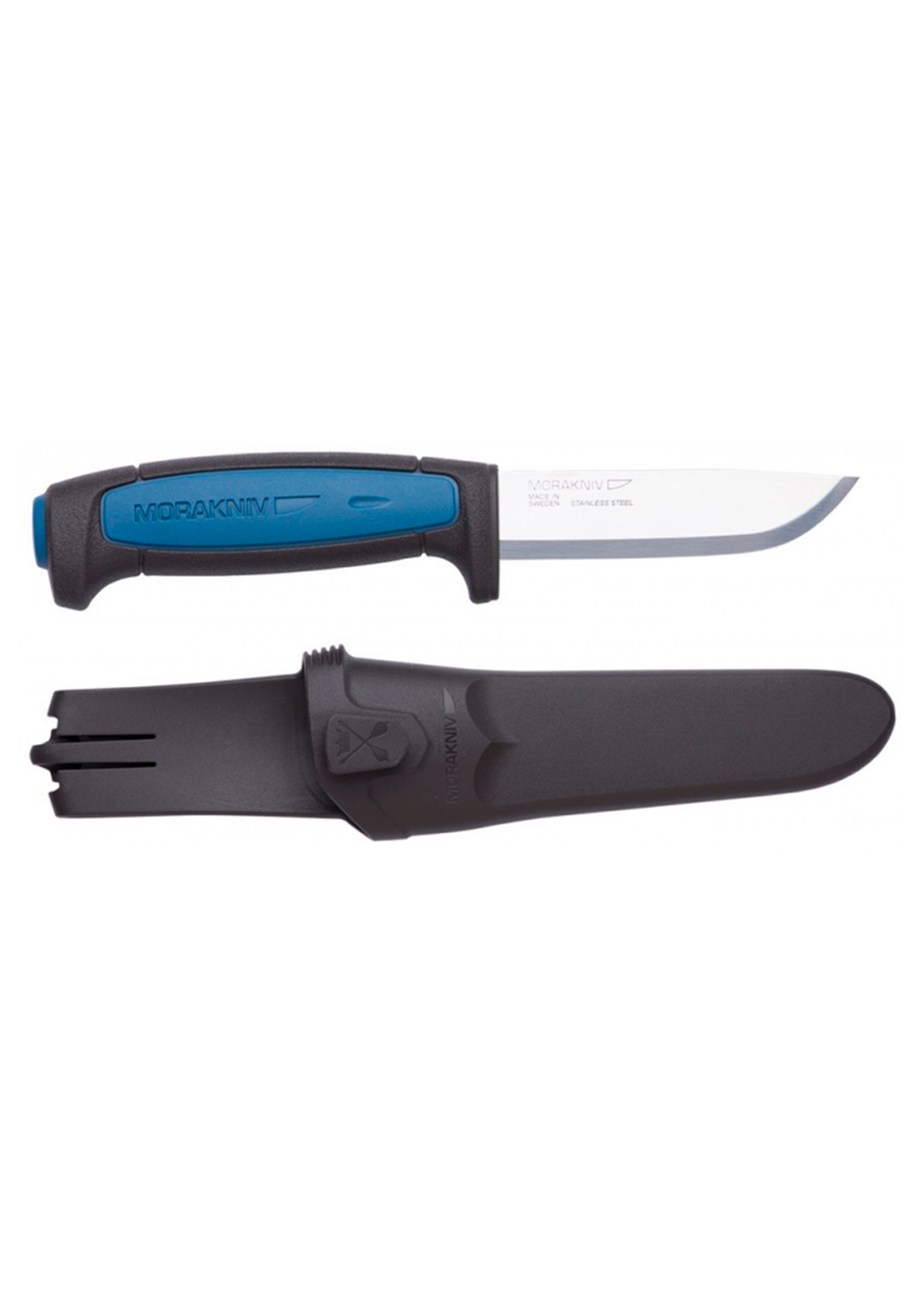 Для изготовления лезвия, использована нержавеющая сталь, произведенная по секретному рецепту компании, и обладающая твердостью 56-58 пунктов по шкале Роквелла (HRC), что, безусловно, сказывается на показателях прочности и износостойкости, а также позволяет ножу долго удерживать остроту. Для эргономичной рукоятки использован черный прорезиненный пластик и вставка синего цвета, на которой выгравирована надпись Morakniv. В области сочленения лезвия и рукоятки, имеется удобный упор, чтобы рука при работе не соскочила и не попала на острое лезвие.