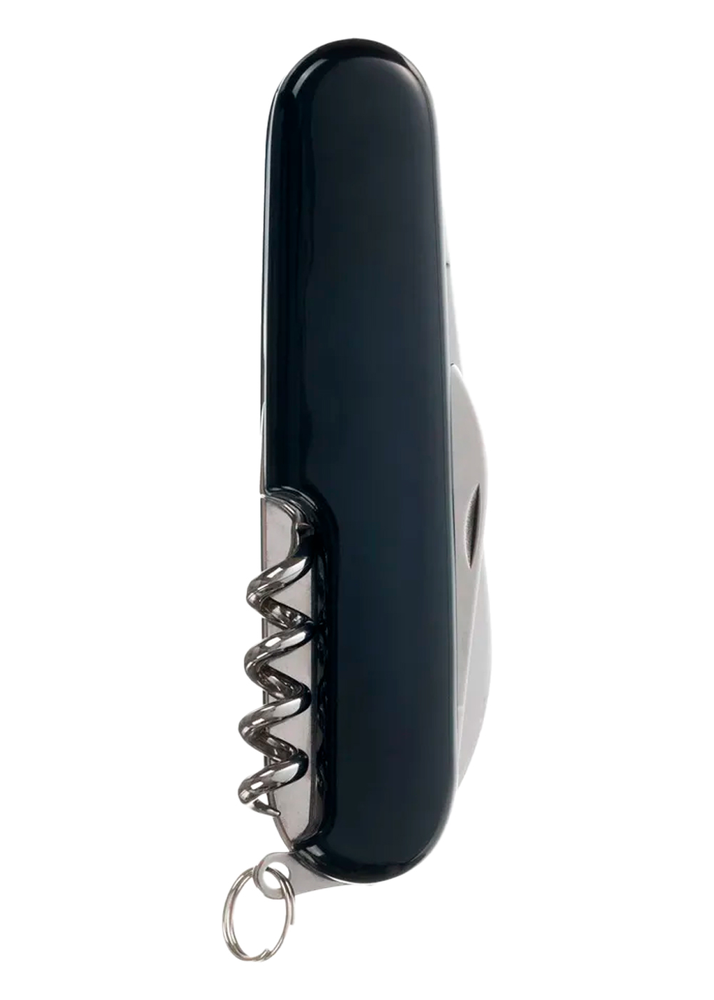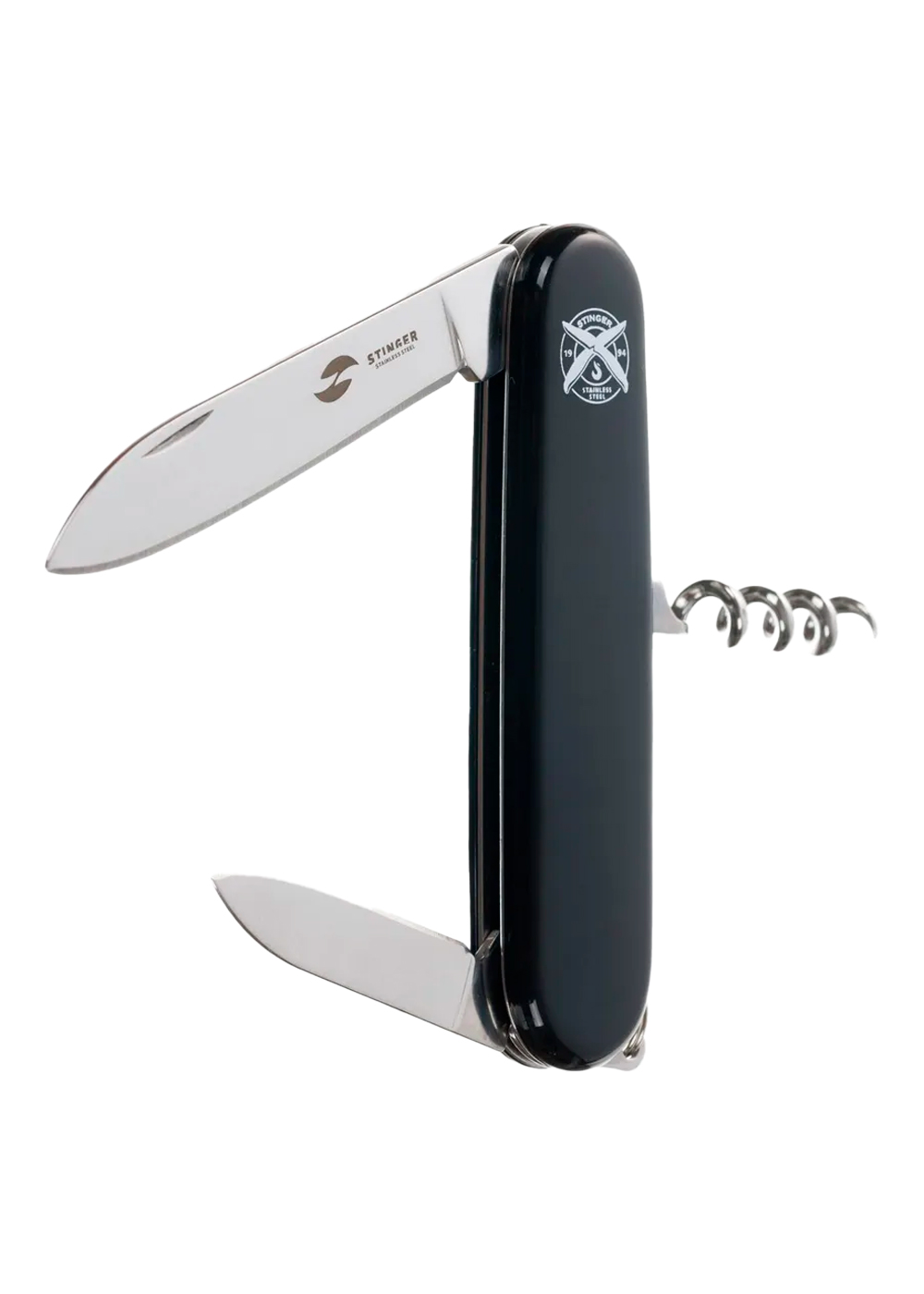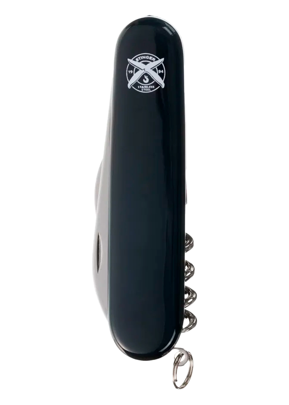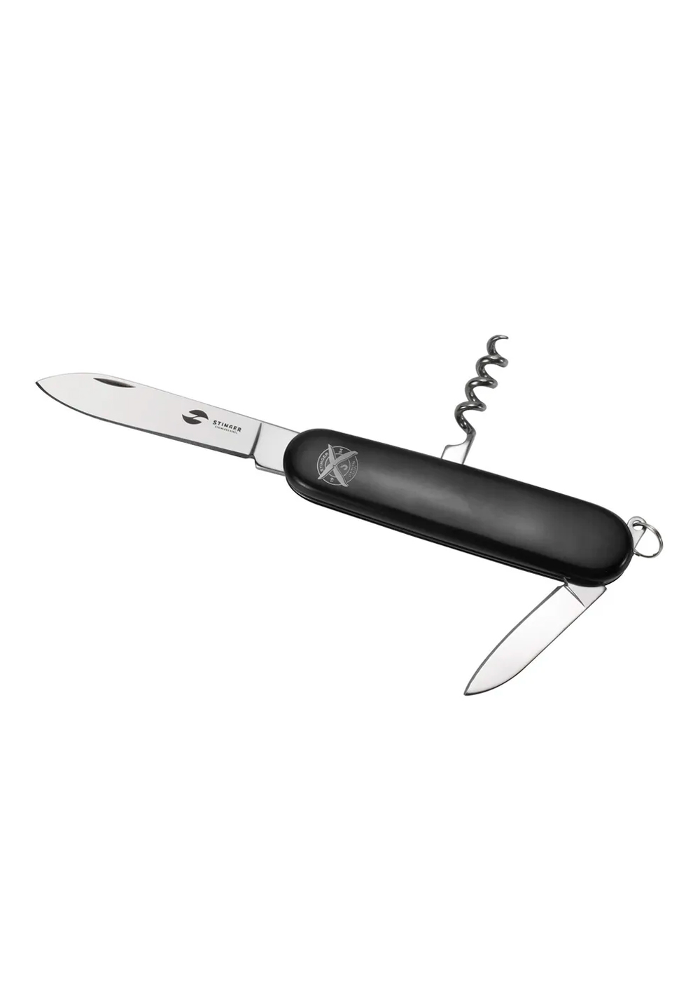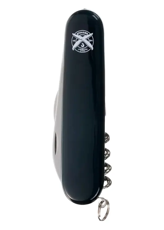 Перочинный нож STINGER FK-K5006NH-4F имеет длину 90 мм и четыре функции: большое и малое лезвия, штопор и кольцо для ключей. Лезвия и инструменты изготовлены из нержавеющей стали AISI 420 с твёрдостью 44–48 HRC, а рукоять — из АБС-пластика чёрного цвета. Нож поставляется в картонной коробке.