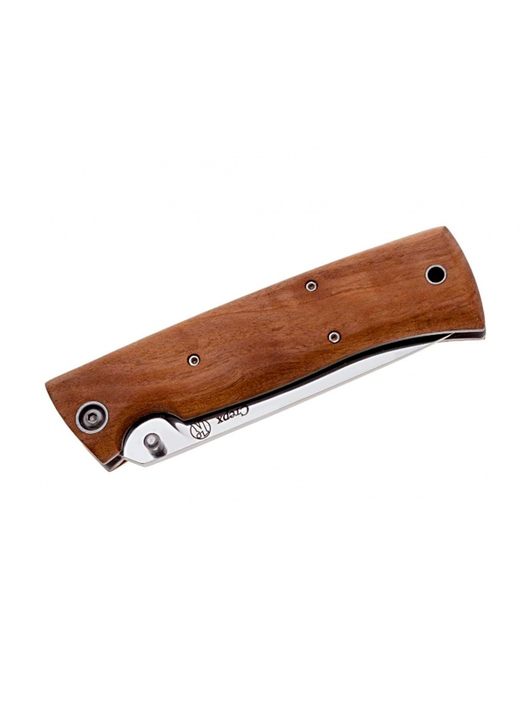 Нож складной Стерх рукоять дерево Клиновая заточка в основном предназначена для лучшего проникновения внутрь разрезаемого материала, но также выдерживает высокие нагрузки при ударах, и нагрузки «на излом». Сталь АUS-8 твёрдость 57-59 HRC, японская нержавеющая сталь золотая середина среди всех ножевых сталей, хорошо держит заточку, сталь легко поддаётся заточке даже подручными средствами, хорошие показатели ударных нагрузок. При не высокой цене, это отличный выбор как профессионалов, так и любителей. Рукоять дерево - кавказский орех, уникальность текстуры и богатство цветовых оттенков являются отличительной чертой кавказского ореха. Дерево устойчиво к влаге, хорошие показатели твёрдости и плотности, что обеспечивает хорошую износостойкость.