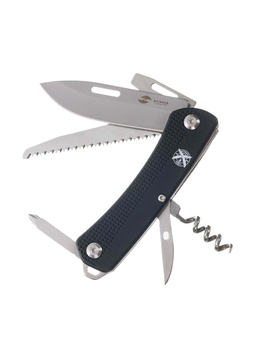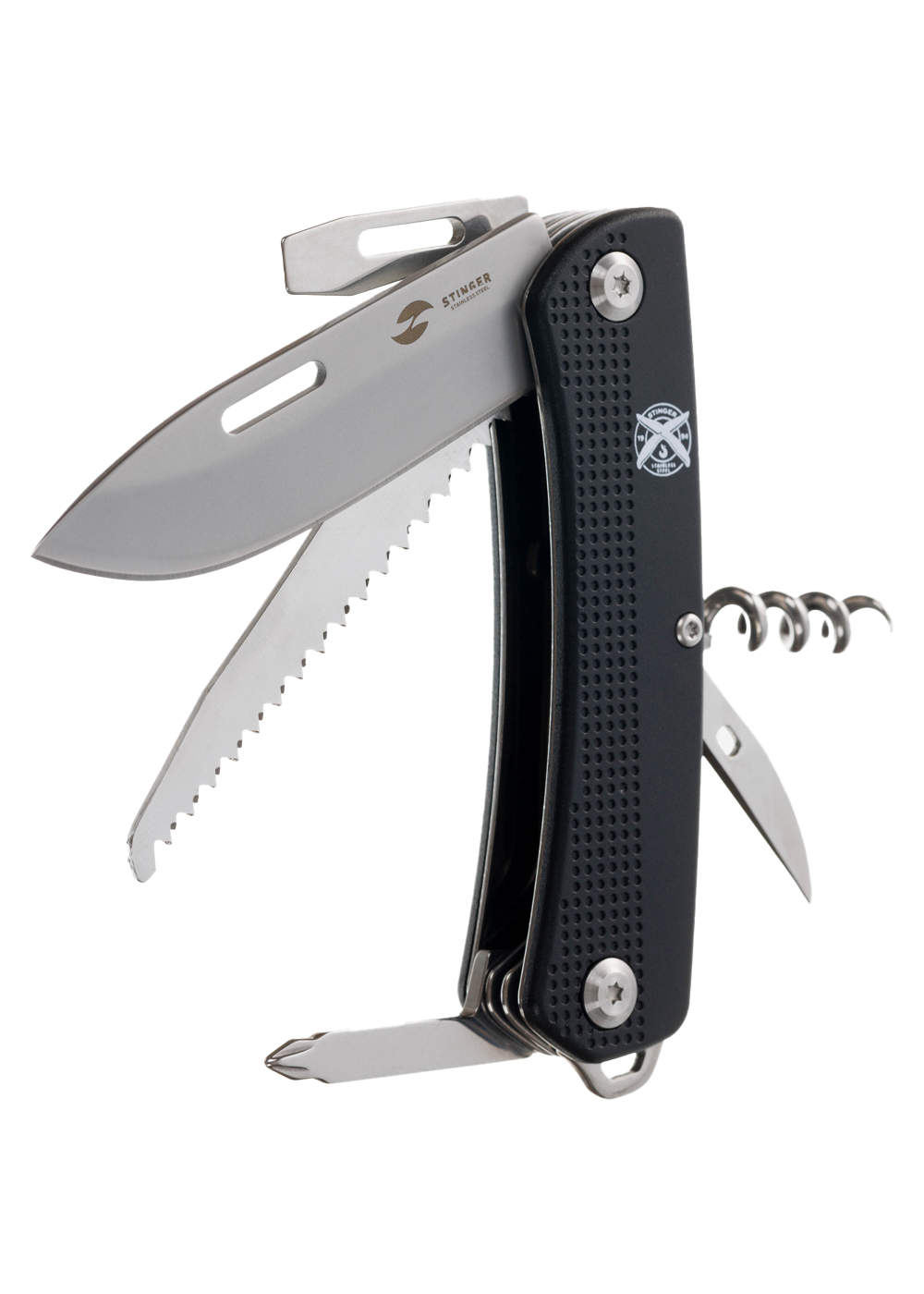 Перочинный нож Stinger имеет 10 функций: лезвие, пила по дереву, открывалка для бутылок с отверткой и инструментом для снятия изоляции, штопор, шило с иглой, крестовая отвертка, держатель для ключей. Материал лезвия и инструментов: нержавеющая сталь 440A, твердость 54–58 HRC. Материал рукояти: нержавеющая сталь 440A, твердость 54–58 HRC. Накладки рукояти из АБС-пластика. Цвет накладок рукояти: черный. Накладки рукояти ножа не подлежат замене. Упаковка: картонная коробка.