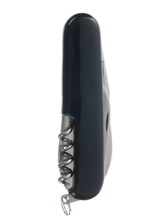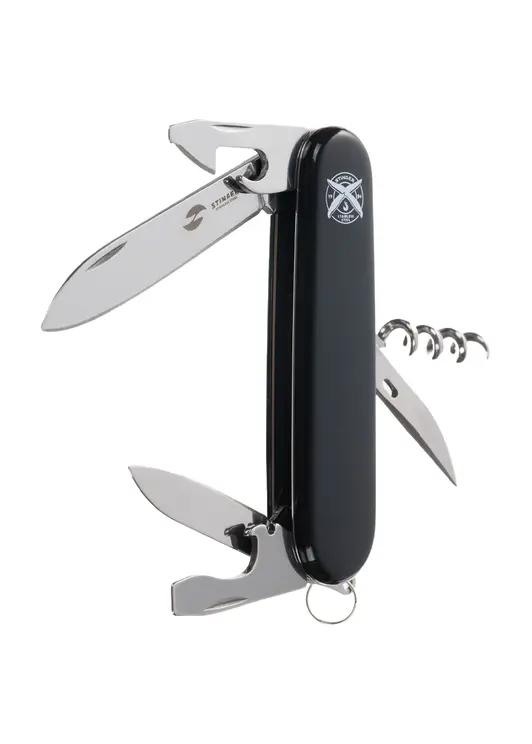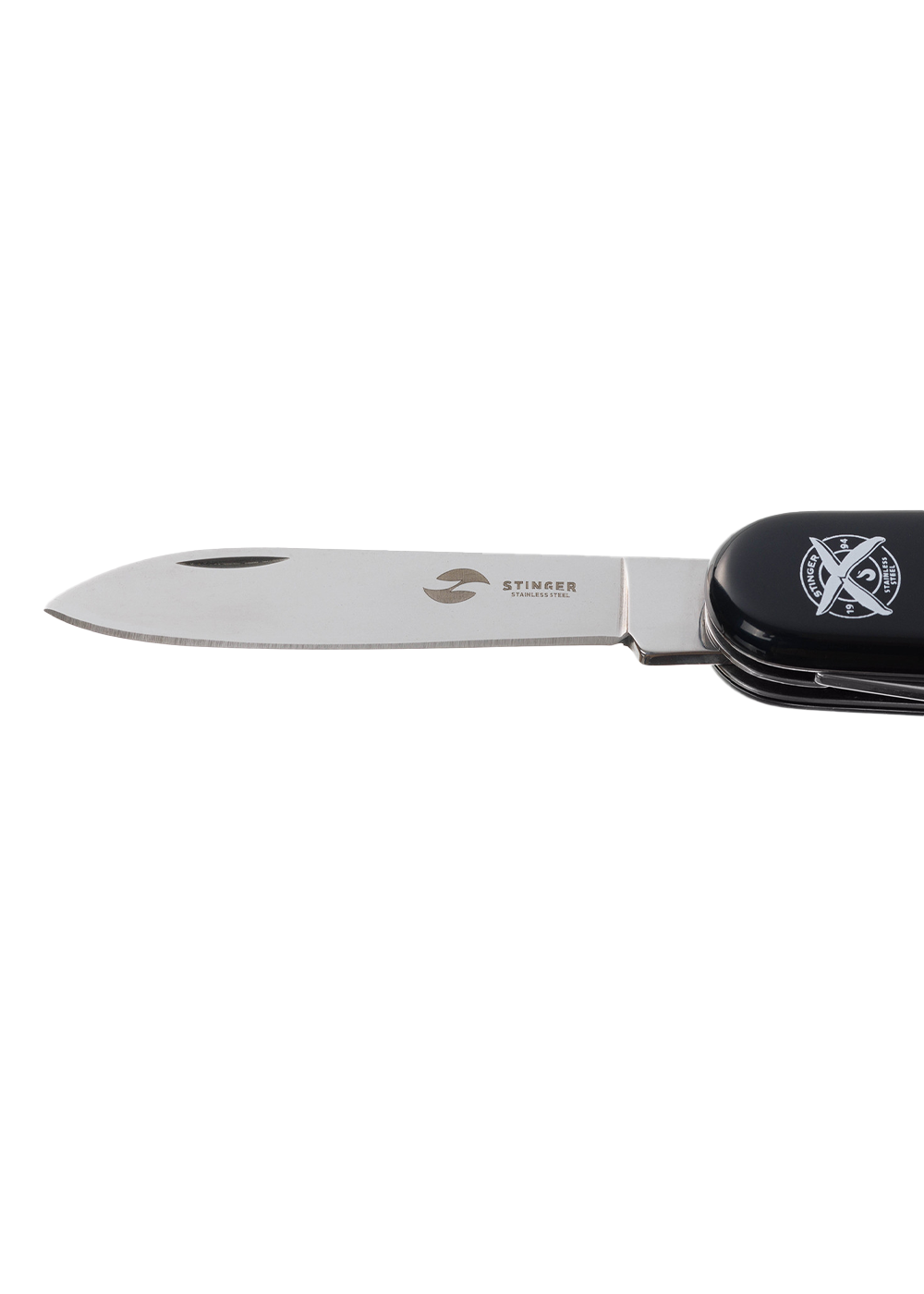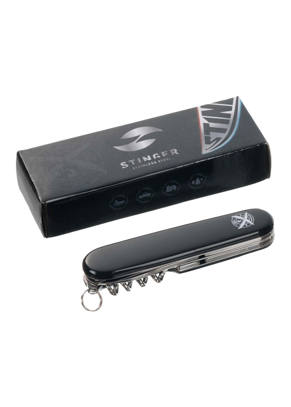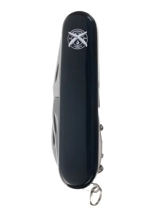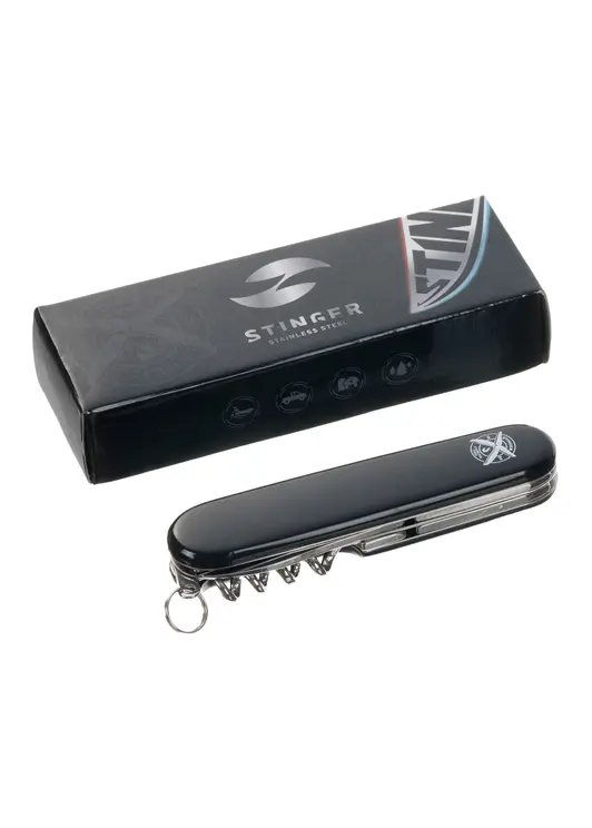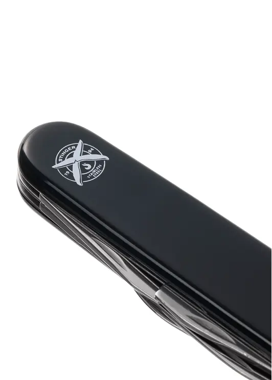 Перочинный нож Stinger имеет 11 функций: большое лезвие, малое лезвие, консервный нож с малой отверткой, штопор, шило с иглой, открывалка для бутылок с отверткой, инструмент для снятия изоляции, кольцо для ключей. Материал лезвия и инструментов: нержавеющая сталь 420, твердость 44–48 HRC. Материал рукояти: нержавеющая сталь 420, твердость 44–48 HRC, с накладками из АБС-пластика. Цвет накладок рукояти: черный. Накладки рукояти ножа не подлежат замене. Упаковка: картонная коробка.
