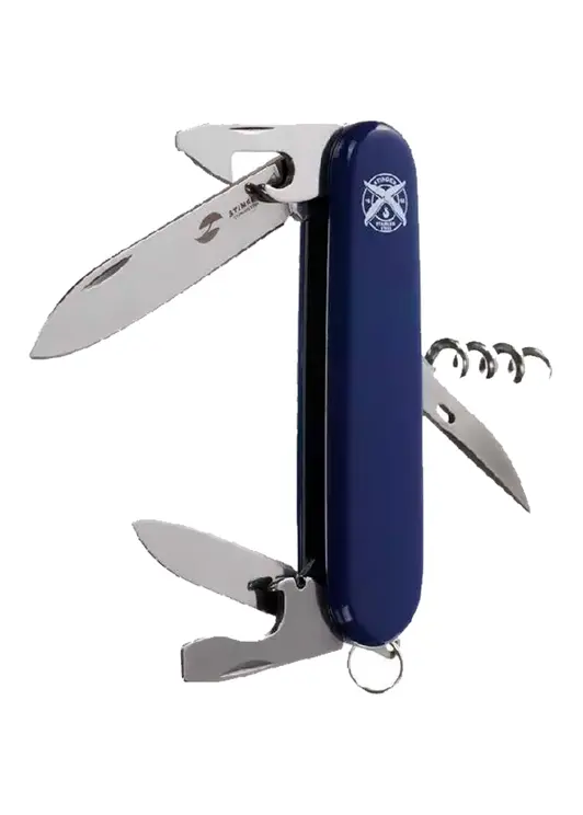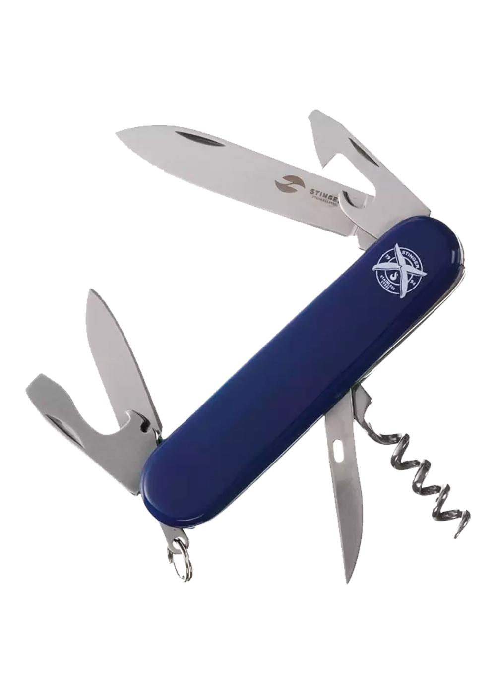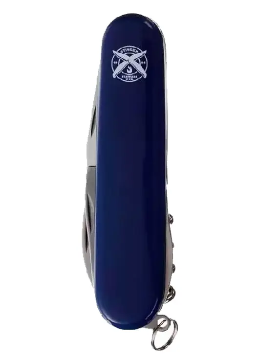 Перочинный нож Stinger имеет 11 функций: большое и малое лезвия, консервный нож, штопор, шило, иглу, открывалку для бутылок, отвёртку, инструмент для снятия изоляции и кольцо для ключей. Нож изготовлен из нержавеющей стали и АБС-пластика, его размеры — 90 × 26,5 × 14 мм, а вес — 80 г.Характеристики: