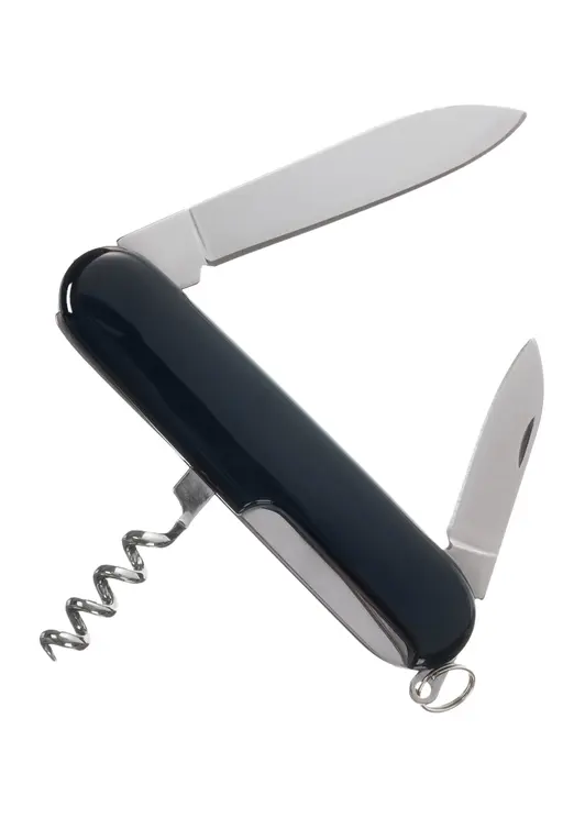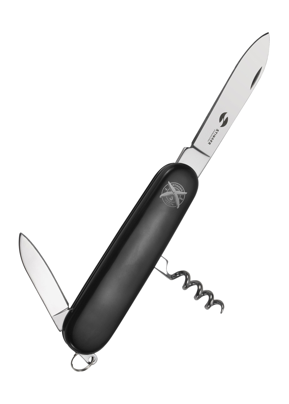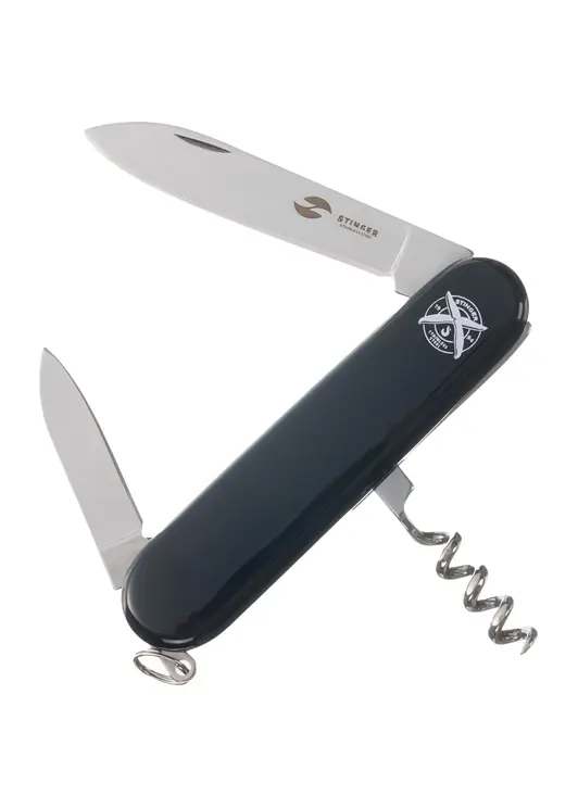 Перочинный нож Stinger имеет 4 функции: большое лезвие, малое лезвие, штопор, кольцо для ключей. Материал лезвия и инструментов: нержавеющая сталь 420, твердость 44–48 HRC. Материал рукояти: нержавеющая сталь 420, твердость 44–48 HRC. Накладки рукояти из АБС-пластика. Цвет накладок рукояти: черный. Накладки рукояти ножа не подлежат замене. Упаковка: картонная коробка.