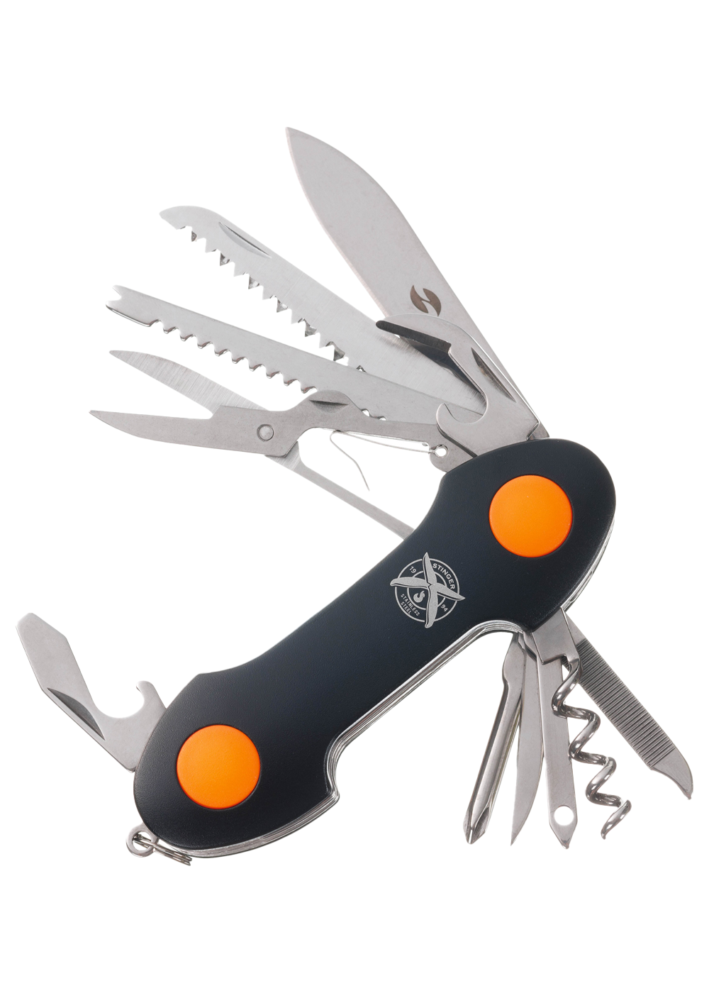 Нож перочинный Stinger, 95 мм, 15 функций, лезвие и инструменты из нержавеющей стали 420, 44-48HRC, рукоять из черного алюминия и оранжевого полипропилена (PP), в картонной коробке