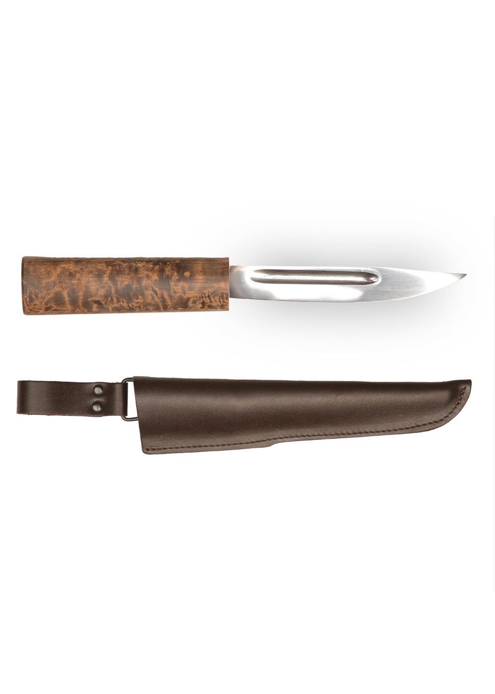 Якутский нож является традиционным оружием народа Саха. Он имеет прямой клинок длиной около 15 см и рукоять, изготовленную из кованой березы. Рукоять имеет кожаную обмотку, которая обеспечивает надежный хват и долговечность ножа. Чехол изготовлен из натуральной кожи и имеет петлю для крепления на пояс. Нож изготовлен из стали ст95х18, которая обладает высокой твердостью и износостойкостью. Этот нож станет отличным подарком для любого охотника или коллекционера.
