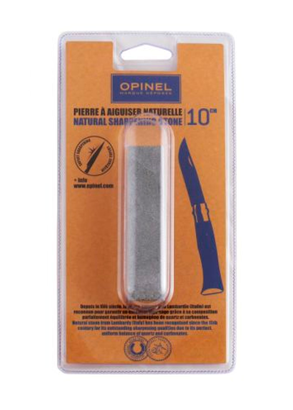 Камень Opinel – это точильный камень, предназначенный для заточки ножей. Он имеет длину 10 см и изготовлен из натурального материала – ломандига (Natural Lombardy), добываемого в Италии. Этот камень обеспечивает качественную заточку ножей, позволяя им сохранять остроту на длительное время.