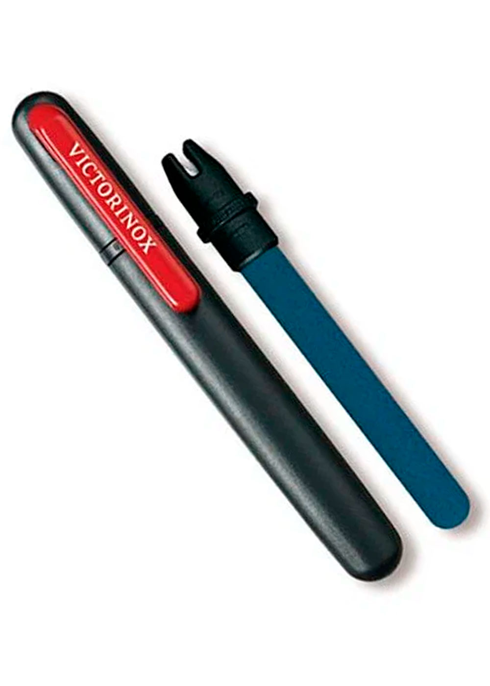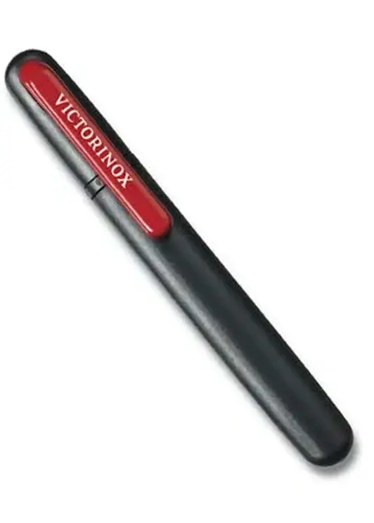 Точилка Victorinox "два в одном", в компактном футляре, размером с шариковую ручку. Длина: 145 мм. Материал абразива: керамика. Насечка: средняя. Рукоять: пластик. Цвет: черный. Вес: 25 г