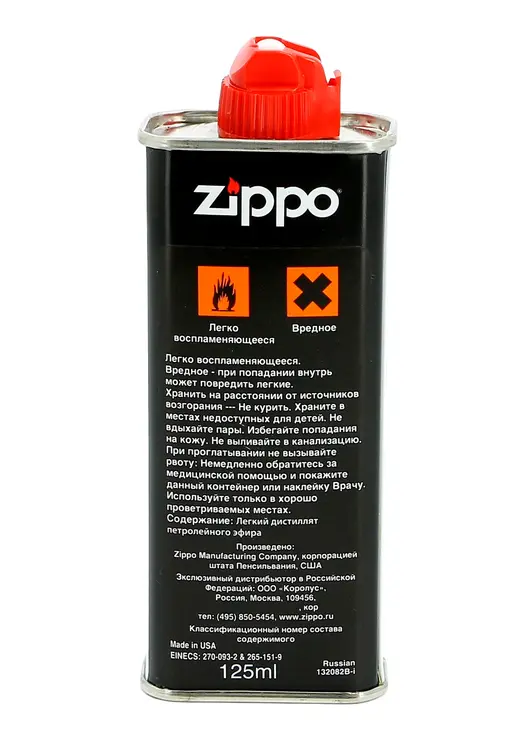 Топливо Zippo объемом 125 мл предназначено для заправки всех типов бензиновых зажигалок. Это очищенное высококачественное топливо, которое обеспечивает стабильное и надежное горение. Топливо Zippo проходит несколько этапов очистки, что гарантирует отсутствие примесей и загрязнений, которые могут повлиять на работу зажигалки. Продукт не содержит вредных добавок и безопасен для окружающей среды.Благодаря высокому качеству топлива, зажигалки работают дольше и стабильнее, что особенно важно для тех, кто часто использует зажигалки в различных условиях. Топливо подходит для всех типов бензиновых зажигалок, что делает его универсальным решением для пользователей различных брендов. Это надежный и качественный продукт для заправки ваших бензиновых зажигалок, обеспечивающий их долгую и стабильную работу.