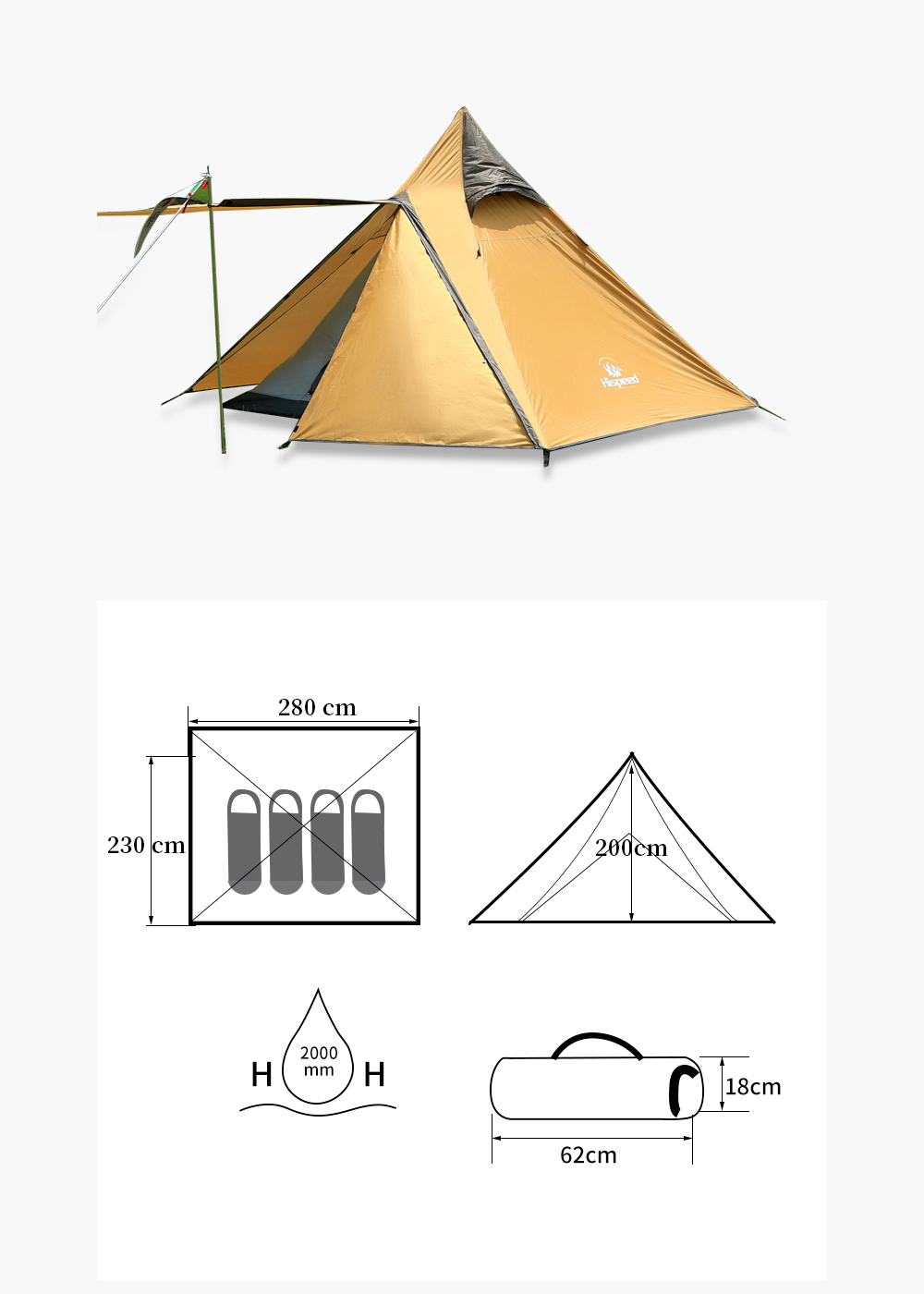 Размеры в разложенном виде: 280×230×200 см – просторное внутреннее пространство для комфортного размещения.