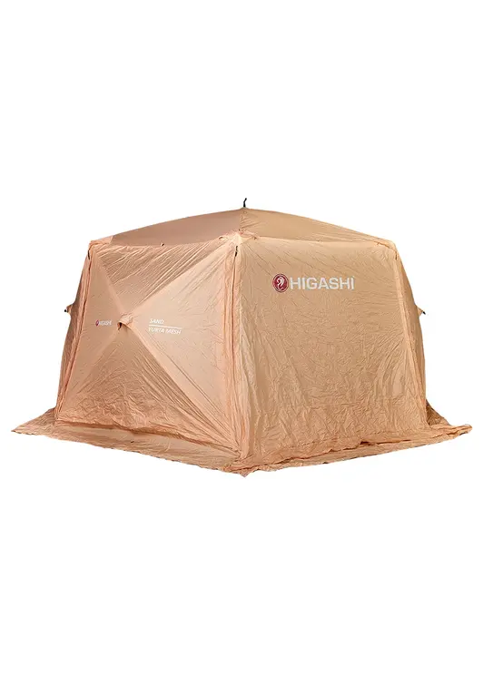 Шатер Хигаши Меш Сэнд снаружи изготовлен из износоустойчивого, водонепроницаемого материала - Polyester 210D. Специальная полиуретановая пропитка позволяет держать уровень водяного столба на уровне 10000 мм (крыша) и 3000 мм (стены).
