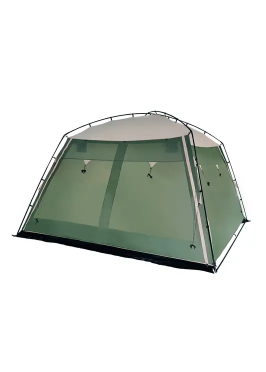 BTrace Camp - палатка-шатер с двумя входами. Ее тент оборудован юбкой, имеет удобные большие размеры, противомоскитную сетку и убирающаяся защиту от дождя. Идеальна для отдыха на открытом воздухе в летнее время, спасает от легкой непогоды, солнца и насекомых. Ветроустойчивость низкая. Проклеены швы на крыше.