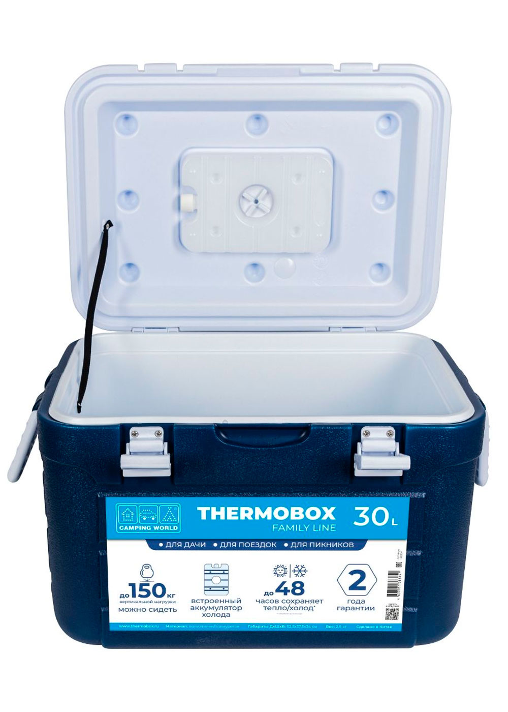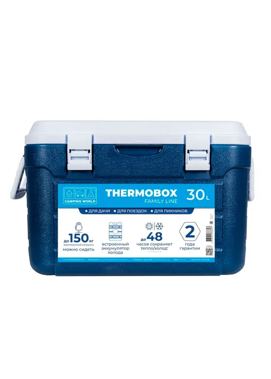 Thermobox 30L сохраняет тепло, холод и подходит для переноски продуктов, напитков и цветов. Контейнер имеет ударопрочный корпус и жёсткую конструкцию, способную выдерживать вертикальную нагрузку до 150 килограммов.
