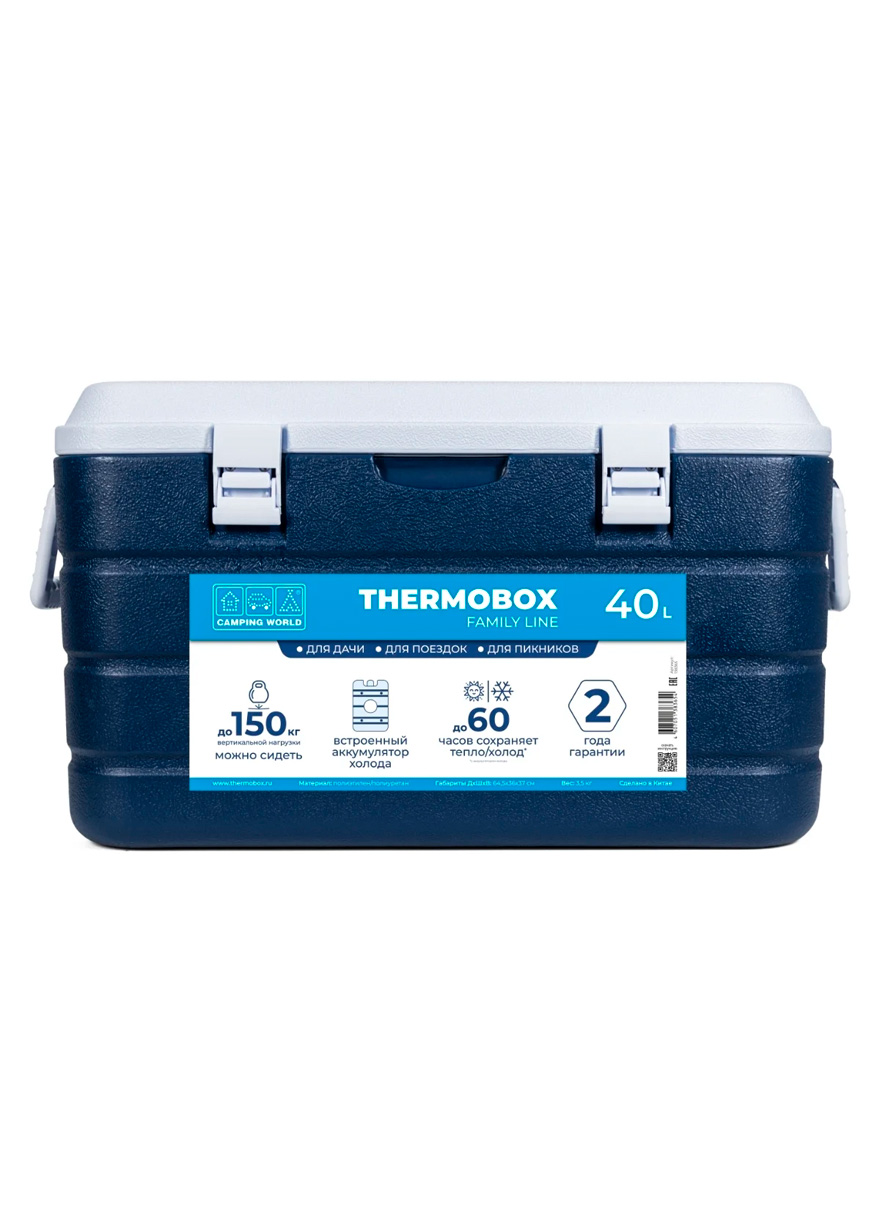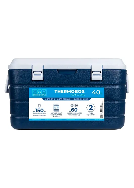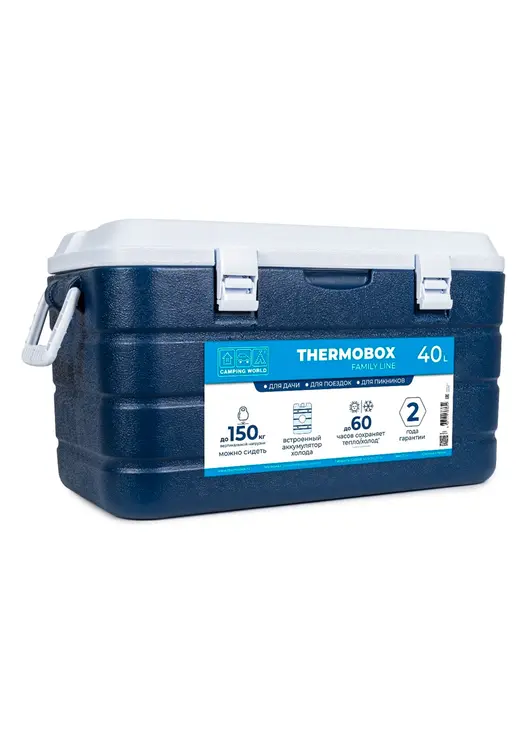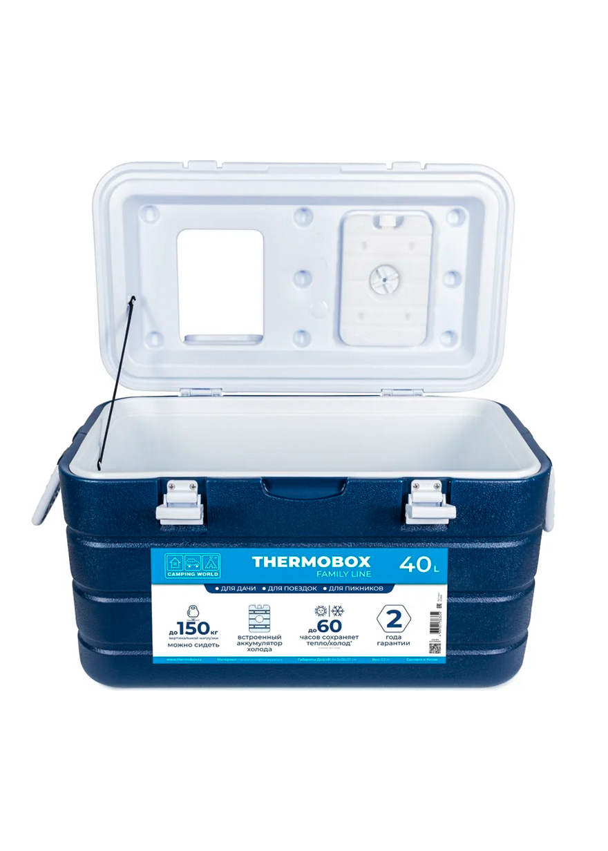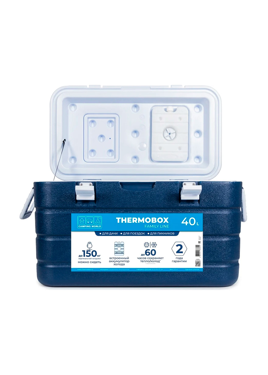 Эта модель контейнера — самая вместительная в линейке, имеет объем 40 литров и сохраняет холод с применением аккумуляторов холода до 60 часов. Подойдет для бытового применения: перевозки продуктов, напитков, заморозки, лекарств, букетов цветов. Термоконтейнер сделан из качественных материалов: полиэтилен высокой прочности, полипропилен, вспененный полиуретан (внутренняя прослойка). Имеет прочный ударопрочный корпус, надежную и жесткую конструкцию. Он выдерживает до 150 кг вертикальной нагрузки. На крышке можно сидеть взрослому человеку, сверху можно ставить другие термобоксы. Плотная крышка надежно прилегает к корпусу, замки из прочного пластика предотвращают случайные открывания и защищают от влияния внешней среды. Для удобства к крышке крепится встроенный аккумуляторы холода. Также в крышке есть маленькое окошко для быстрого доступа к продуктам. На поверхности предусмотрены подстаканники, используйте этот термоконтейнер в качестве стола во время пикника на природе. Для переноски у есть боковые ручки, его смогут нести сразу два человека. Внизу корпуса находится отверстие для слива конденсата. В любую жару внутри ящика не будет скапливаться лишняя жидкость.