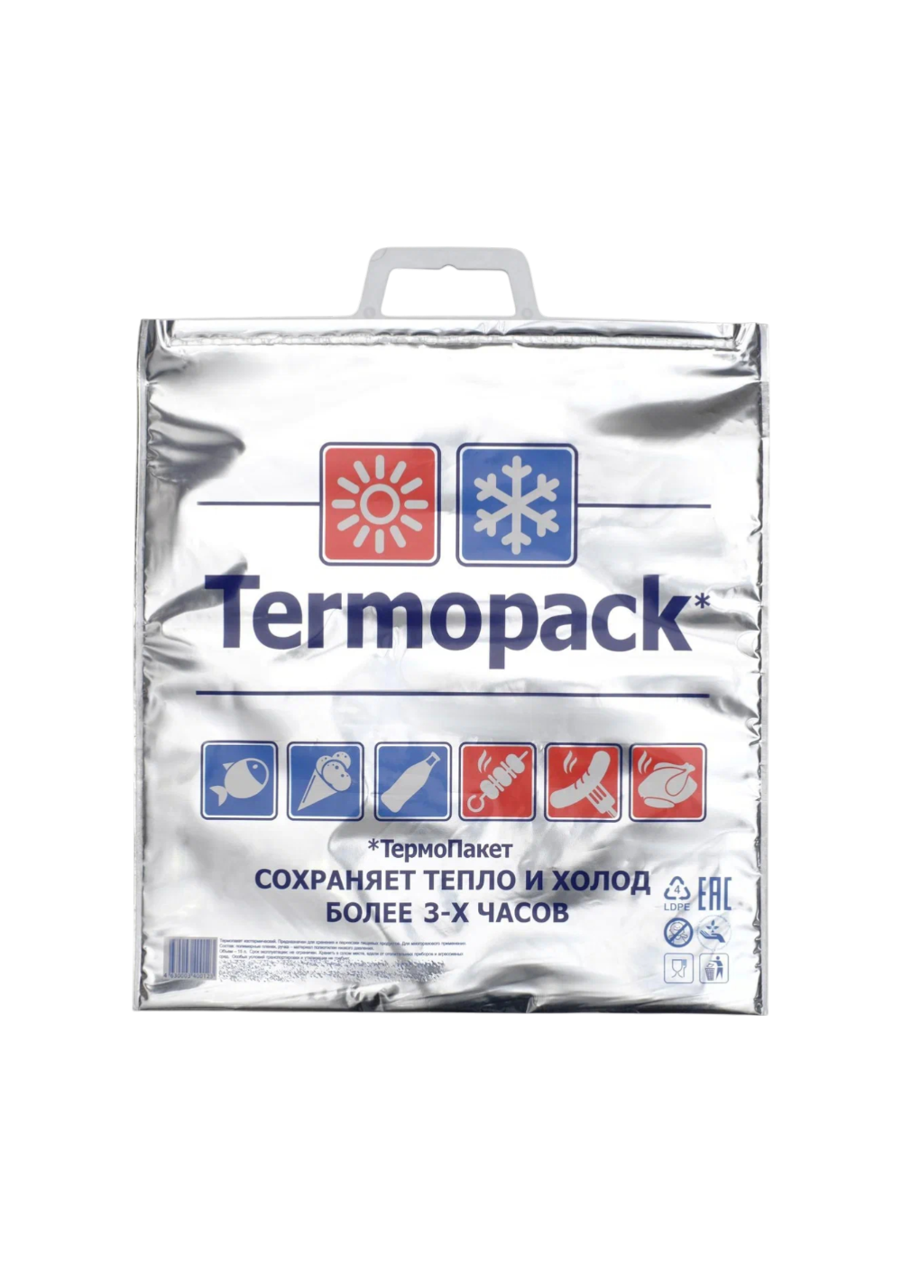 - Металлизированный защитный материал: Сумка выполнена из плотного полиэтилена с фольгированным покрытием, безопасного для пищевых продуктов. Эта отделка надежно сохраняет тепло или холод на длительный период, что делает ее идеальной для пикников и поездок.