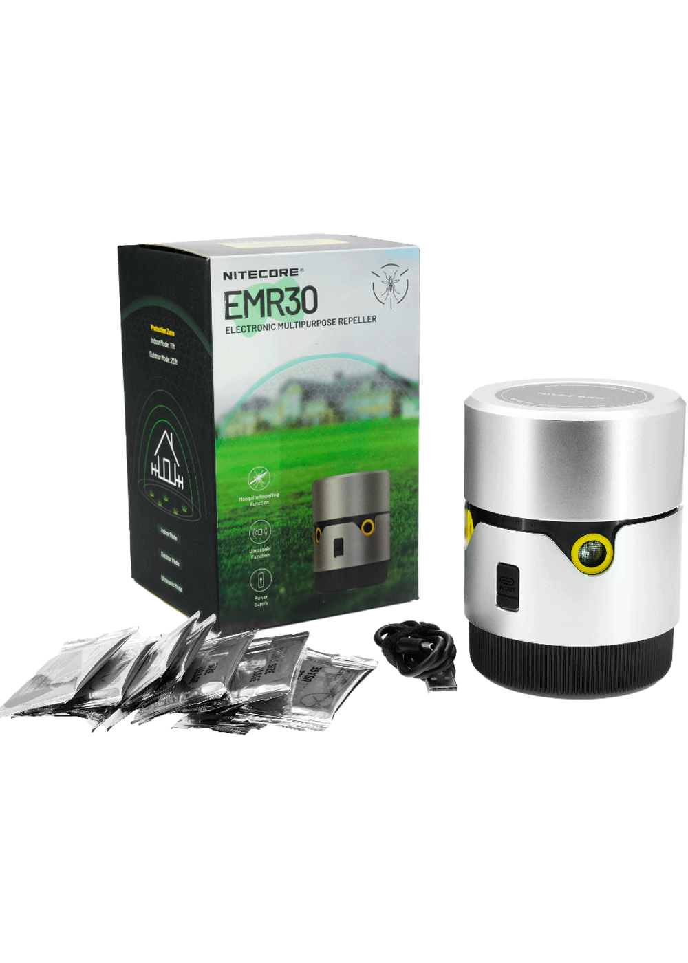 Электронный многоцелевой отпугиватель EMR30 – это отличное средство от комаров, может отпугнуть комаров за 10 минут. Встроенная система активной диффузии может эффективно увеличить зону защиты от комаров, максимальная зона защиты у EMR30 20 футов - это на 200% больше, чем у обычного средства от комаров. Питание от встроенного литий-ионного аккумулятора обеспечивает максимальное время работы 12 часов на открытом воздухе, а также его можно использовать при подключении к источнику питания в помещении.