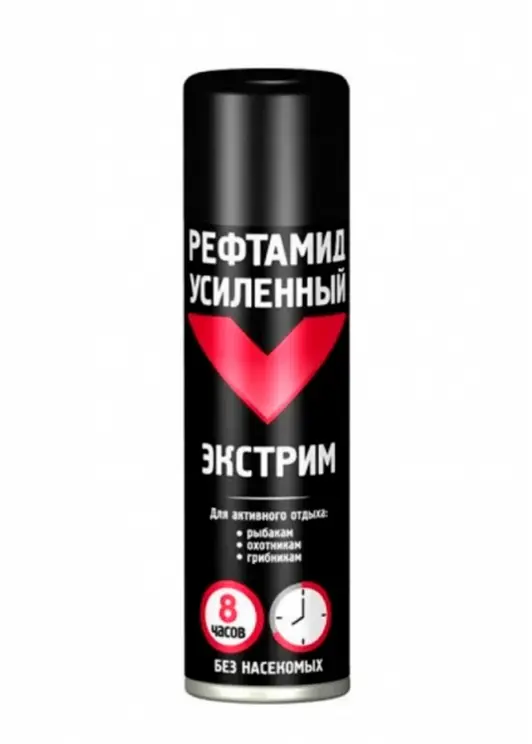 Репеллент «Рефтамид Экстрим» усиленный, 150 мл, 5-03.09.130.01 (03.09.230.01), предназначен для защиты от комаров, мокрецов, москитов, мошек, слепней, блох и лесных и таёжных клещей. Содержит N, N-диэтил-м-толуамид (ДЭТА) 40% и диметилфталат (ДМФ) 5%. Бутан/пропан/изобутан составляет более 30%. Этиловый спирт денатурированный — 5–15%. Вспомогательные компоненты — менее 5%. Отдушка — менее 5%.
