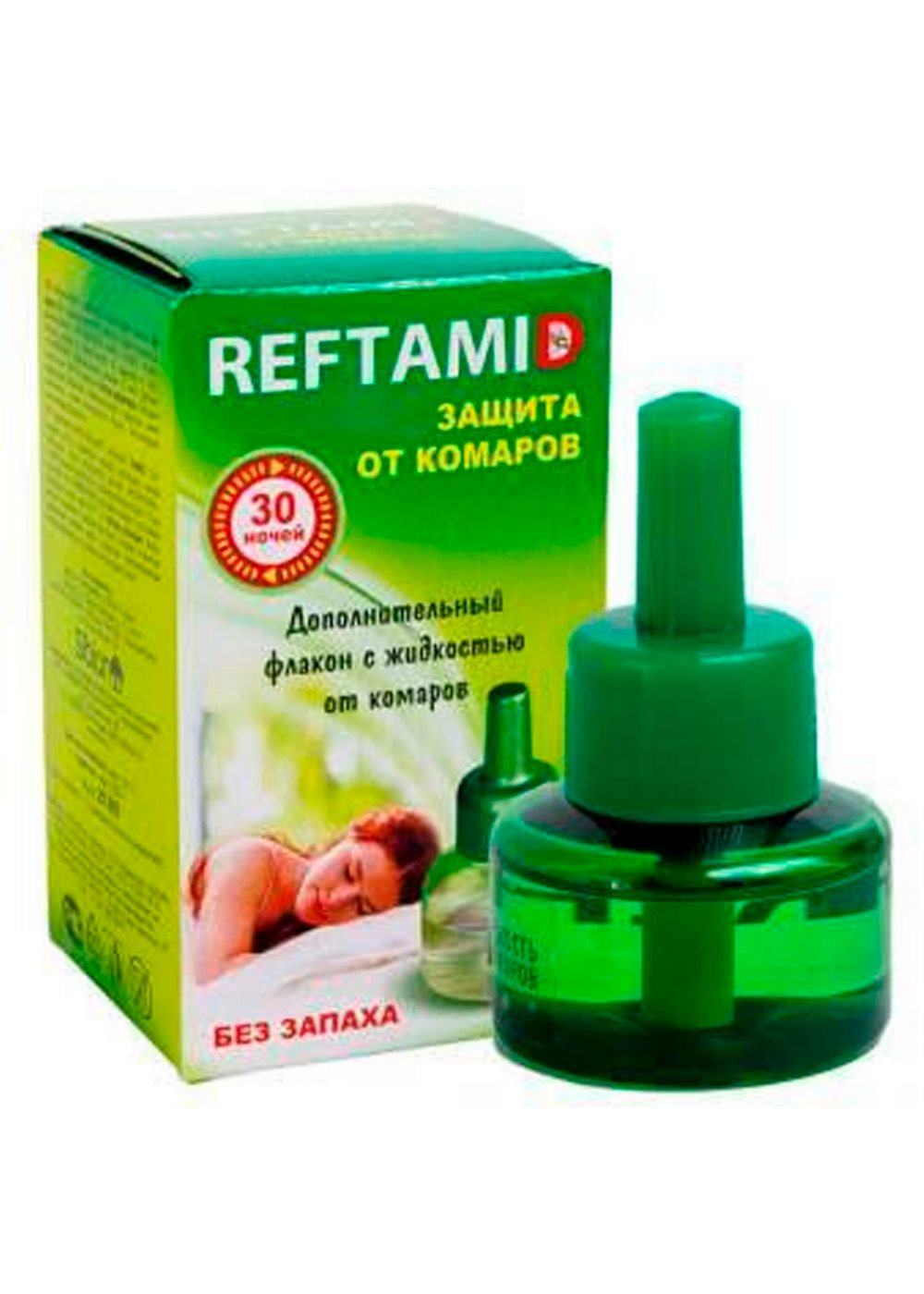 Средство от насекомых Рефтамид от комаров жидкость для фумигатора. Предназначено для уничтожения комаров в помещениях. Способ применения: Вынуть из упаковки флакон с раствором, снять защитный колпачок, ввернуть флакон в электроприбор до упора и включить его в электросеть 220В при вертикальном положении флакона. Полное уничтожение насекомых достигается менее чем за 1 час. При открытых окнах (форточках) электроприбор с флаконом можно оставлять включенным на всю ночь для уничтожения залетающих комаров и других насекомых. Электроприбор выключить, флакон вывинтить, закрыть защитным колпачком и сохранять до последующего использования. Использовать в помещении площадью не менее 13 м. кв. При закрытых окнах и форточках применять в отсутствии людей. Обязательно размещать на расстоянии не менее 1 м от кровати ребенка и постоянного местонахождения человека.
