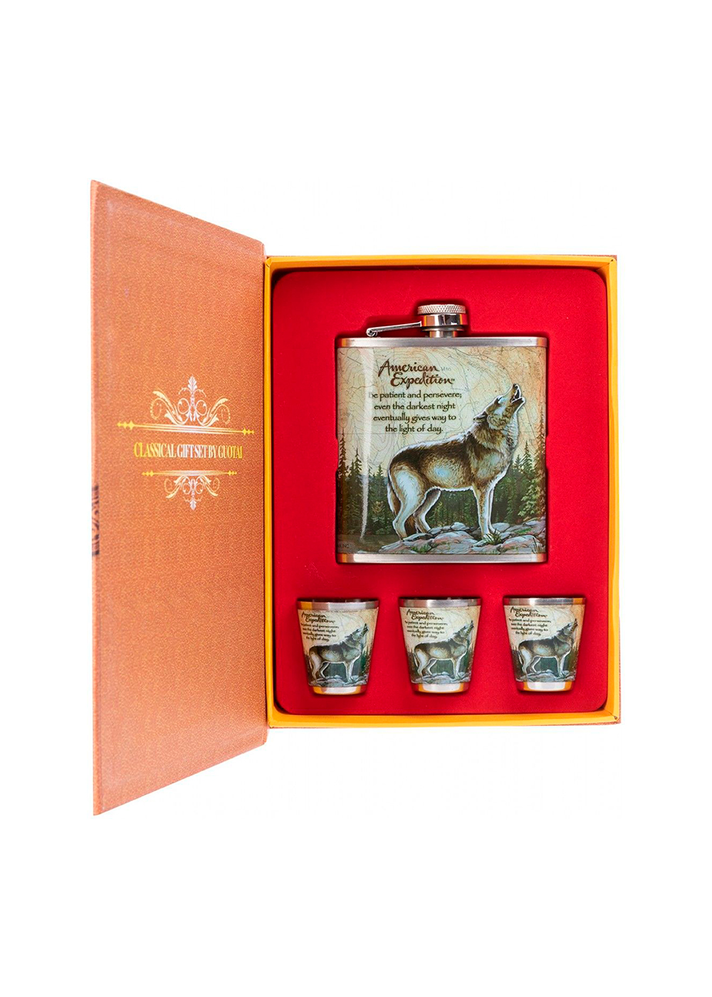 Набор “Волк” состоит из фляжки объемом 210 мл и трех стопок. Он выполнен из нержавеющей стали и украшен изображением волка. Этот набор станет отличным подарком для любого мужчины, который любит активный отдых и приключения.