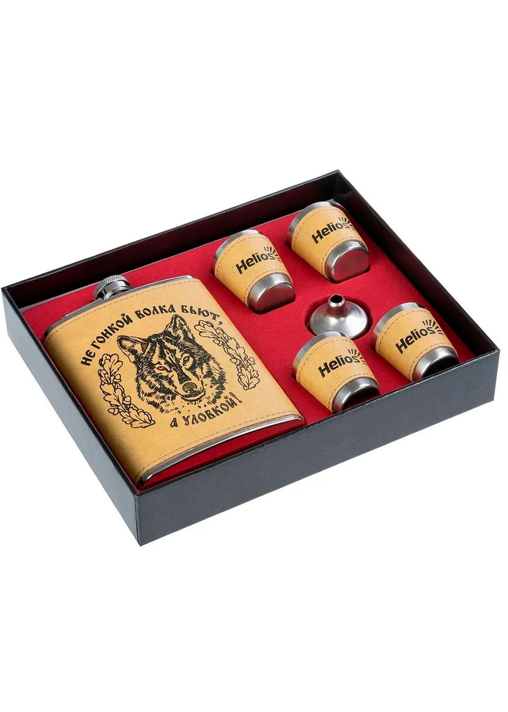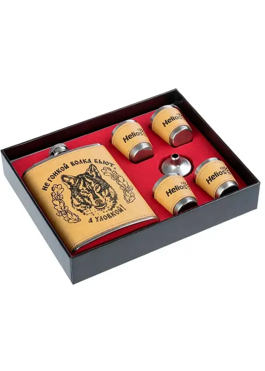Набор “Волк” от Helios состоит из фляжки на 240 мл, четырех стопок и воронки для удобного наполнения фляжки. Все предметы изготовлены из нержавеющей стали и имеют изображение волка. Отличный подарок для мужчин, которые ценят качество и стиль.
