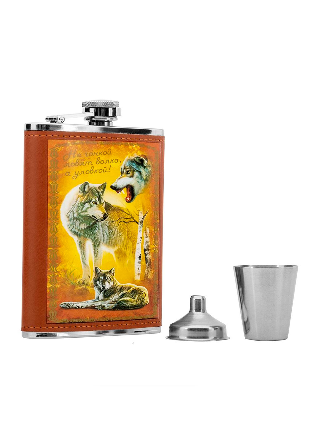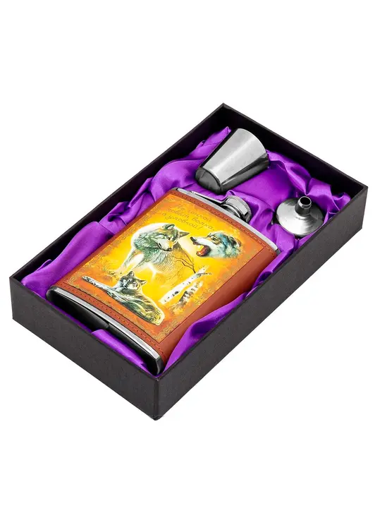 В этом наборе есть все необходимое для того, чтобы насладиться горячительными напитками в компании друзей. Фляжка на 240 мл выполнена из нержавеющей стали и имеет изображение волка на корпусе. Стопка также украшена волком, а воронка поможет удобно наполнить фляжку.