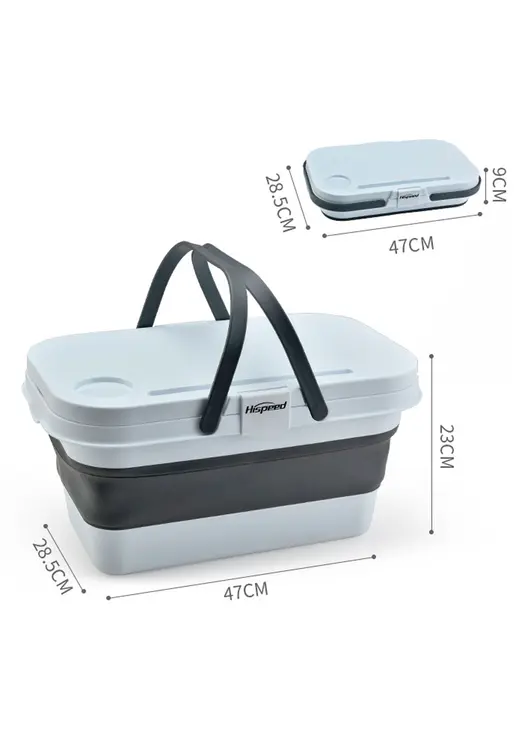 Корзина складная и разделена на три секции: одна секция служит столиком, а две другие — удобными емкостями для хранения продуктов и посуды. Это позволяет легко организовать пространство для приема пищи и хранения всего необходимого.