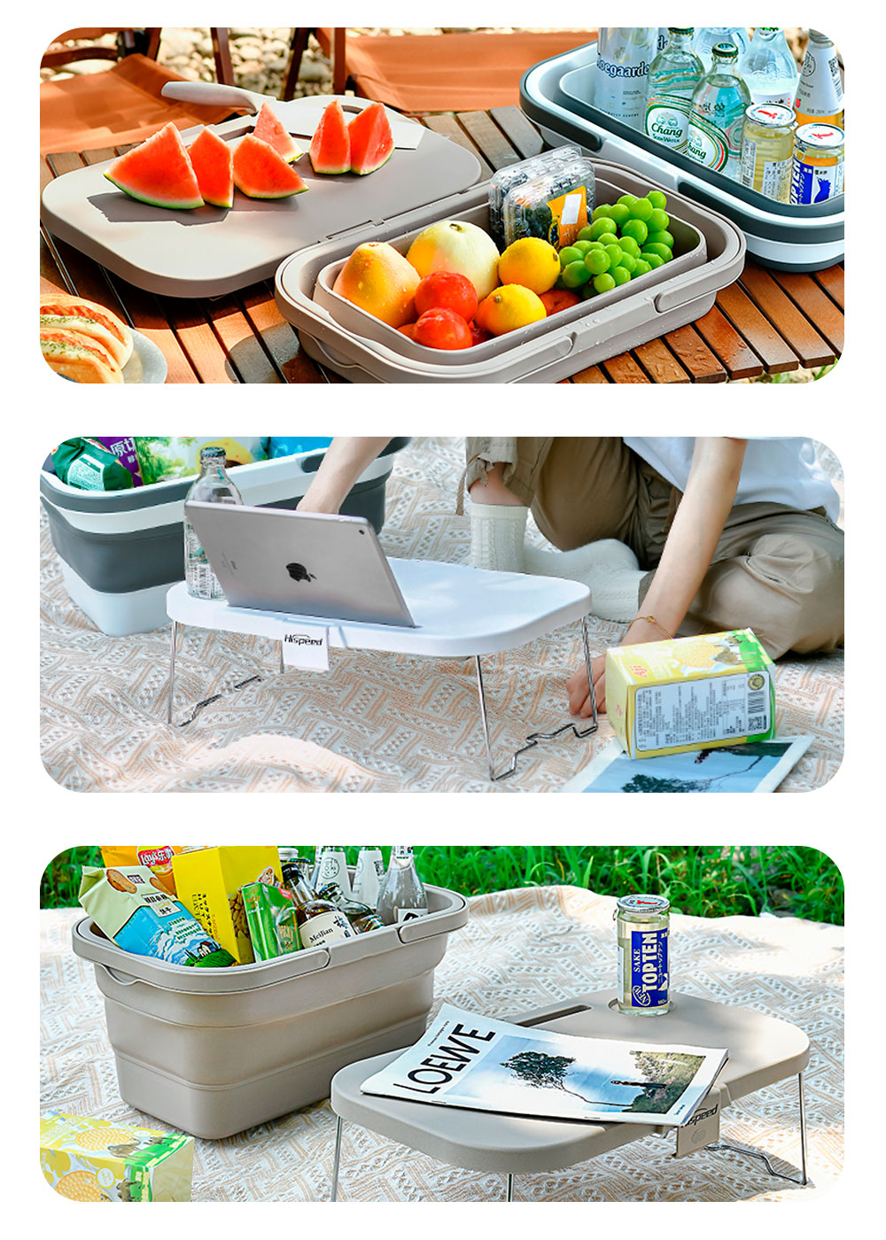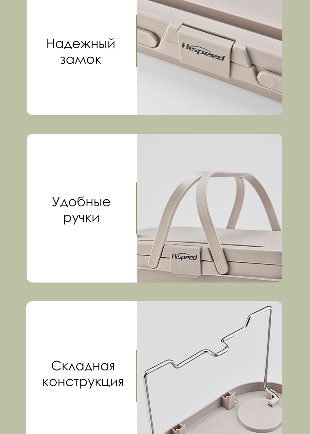 Конструкция: Складная, разделена на 3 секции (1 столик и 2 емкости для продуктов).