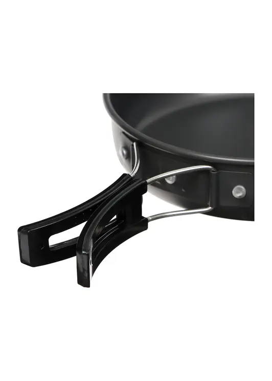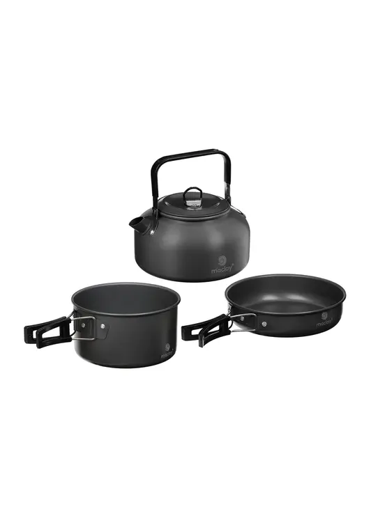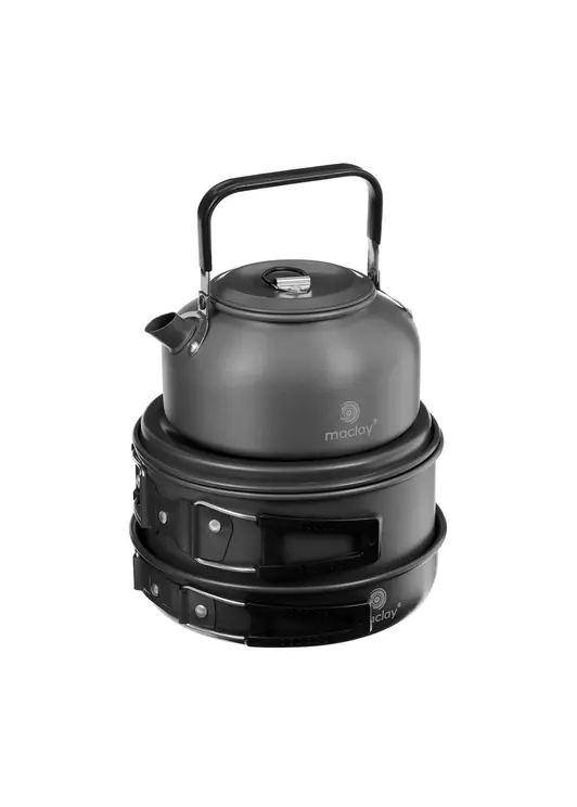 Набор туристической посуды Maclay в сетчатой упаковке включает чайник объёмом 0,8 л, кастрюлю на 2 л с откидными ручками и сковороду диаметром 17 см объёмом 1,1 л. Все предметы изготовлены из анодированного алюминия с термоизолирующим покрытием, что обеспечивает равномерный нагрев и комфортное использование. Компактная конструкция с возможностью складывания экономит место при транспортировке, а прочный сетчатый чехол защищает посуду и обеспечивает удобство хранения. Набор идеально подходит для приготовления пищи в походных условиях и кемпинге.