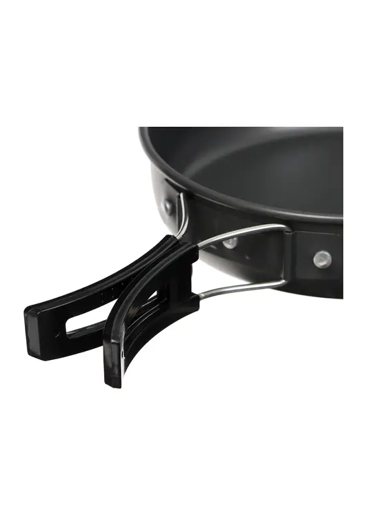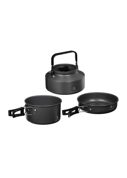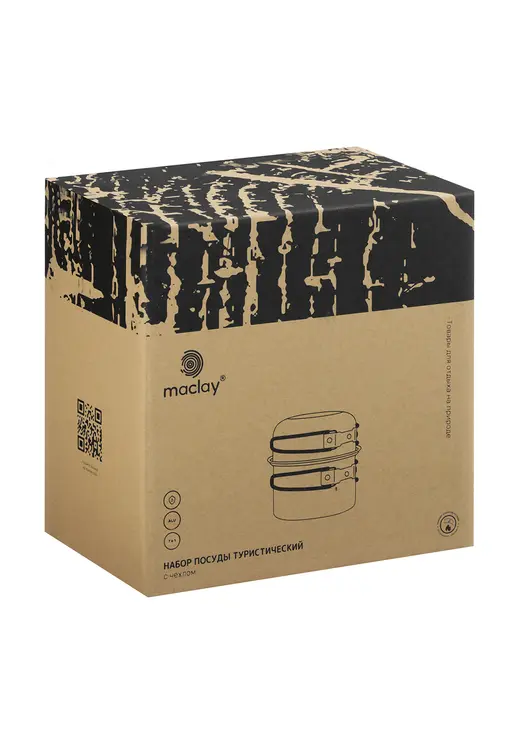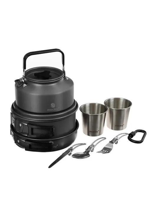 Набор туристической посуды Maclay — практичный комплект для приготовления пищи в походных условиях, включающий кастрюлю объёмом 1,2 л с откидными ручками, сковороду диаметром 18 см на 0,8 л, чайник на 1,1 л, два стакана, складные столовые приборы (ложку, вилку, нож) и карабин для крепления. Все предметы изготовлены из анодированного алюминия с термоизолирующим покрытием, что обеспечивает долговечность и удобство использования. Компактная конструкция с возможностью складывания экономит место при транспортировке, а продуманная комплектация позволяет организовать полноценное питание в условиях активного отдыха или кемпинга.