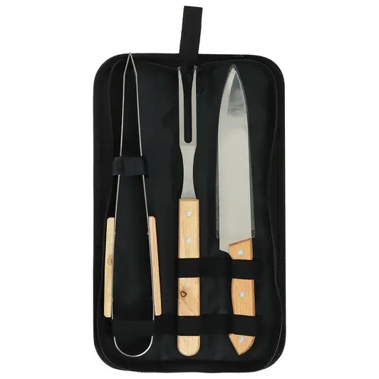 В набор Maclay входит всё необходимое для приготовления пищи на гриле или барбекю. В комплекте есть вилка для мяса, нож, щипцы и чехол для хранения и переноски. Рабочая поверхность приборов выполнена из нержавеющей стали, ручки — из дерева.