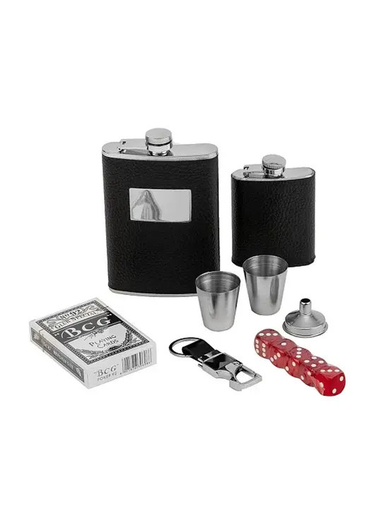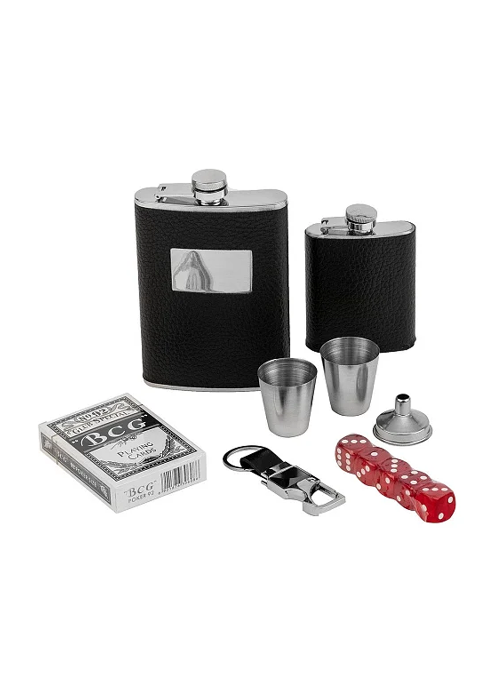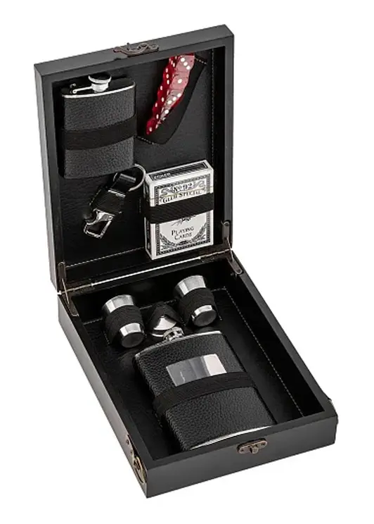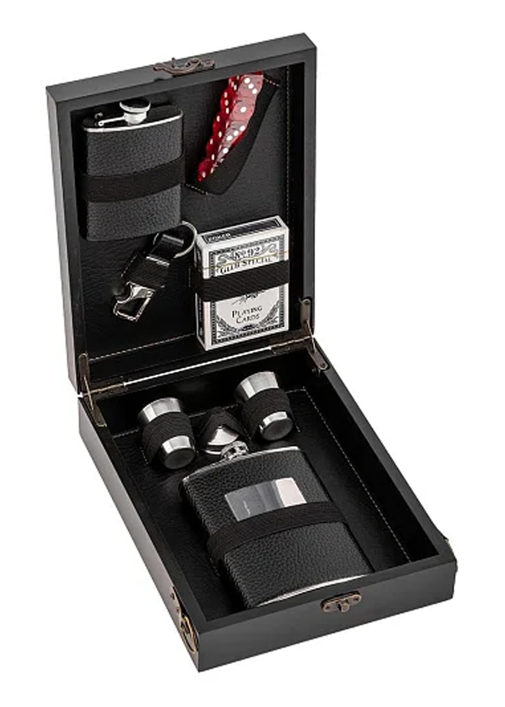 Комплектация:- фляжка 270 мл 1шт- стопки 2шт- воронка 1шт- фляжка 120 мл 1шт- брелок 1 шт- игральные карты 1 пачка- игральные кости 5шт