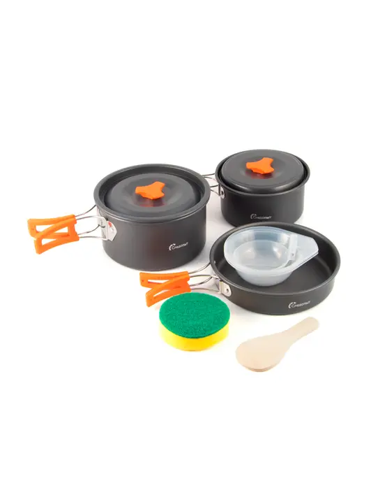 Набор кемпинговой посуды “СЛЕДОПЫТ - Travel” — это идеальный выбор для комфортного отдыха на природе, рыбалки, охоты или кемпинга. Набор изготовлен из анодированного алюминия, который обладает высокой прочностью и сопротивляемостью к коррозии, обеспечивая долгий срок эксплуатации. Компактные размеры и легкий вес (640 г) делают набор удобным для транспортировки и хранения. Предназначен для кипячения и подогрева воды, заваривания чая или приготовления различных напитков и блюд для небольшой группы людей во время загородных путешествий, на рыбалке, охоте или в кемпинге. Набор включает все необходимое для комфортного приготовления пищи на природе: кастрюли, сковорода, миски, лопатка, губка и складной половник. Все предметы упакованы в удобный чехол из полиэстера, что обеспечивает их безопасное хранение и транспортировку. Складные ручки, крышки, ненагревающиеся ручки. Набор кемпинговой посуды “СЛЕДОПЫТ - Travel” на 3-4 персоны — это надежное и практичное решение для любителей активного отдыха, сочетающее в себе компактность, легкость и функциональность.