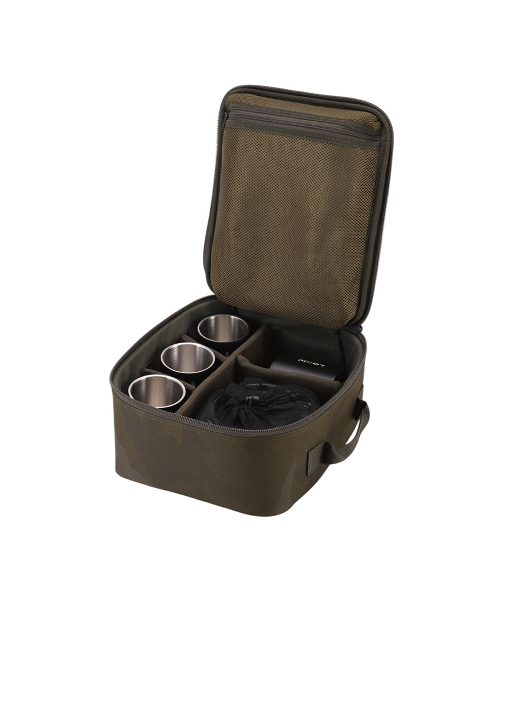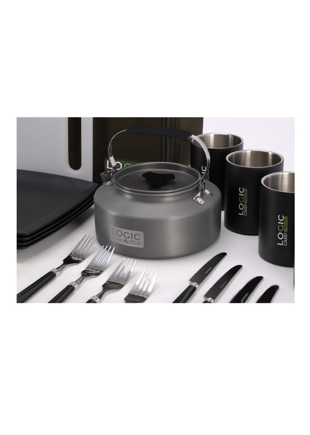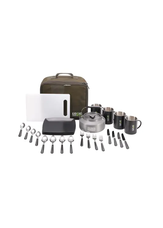 Набор посуды LOGIC CARP 4MAN MUGS & KETTLE DINNING SET — функциональный комплект для комфортного приёма пищи на природе на четыре персоны. В набор входит алюминиевый чайник объёмом 1,6 л, четыре изотермические кружки по 400 мл, четыре тарелки размером 22×22 см, столовые приборы (вилки, ложки, ножи) и специальный чехол для их хранения. Все предметы изготовлены из прочных материалов: кружки сохраняют тепло напитков благодаря двойным стенкам, тарелки не впитывают запахи, а приборы выполнены из нержавеющей стали. Комплект поставляется в удобной сумке-чехле размером 33×28×15 см, обеспечивающей компактное хранение и транспортировку. Дополнительно в набор входит пластиковая разделочная доска 30×20 см. Набор идеально подходит для рыбалки, кемпинга и путешествий большой компанией.