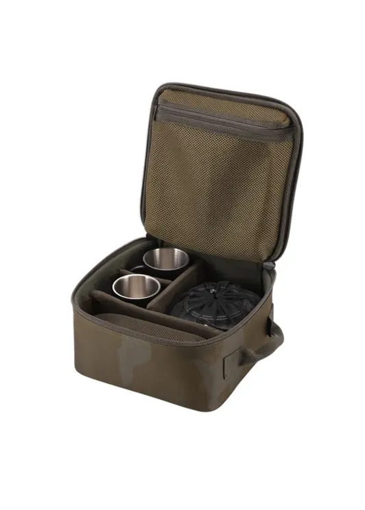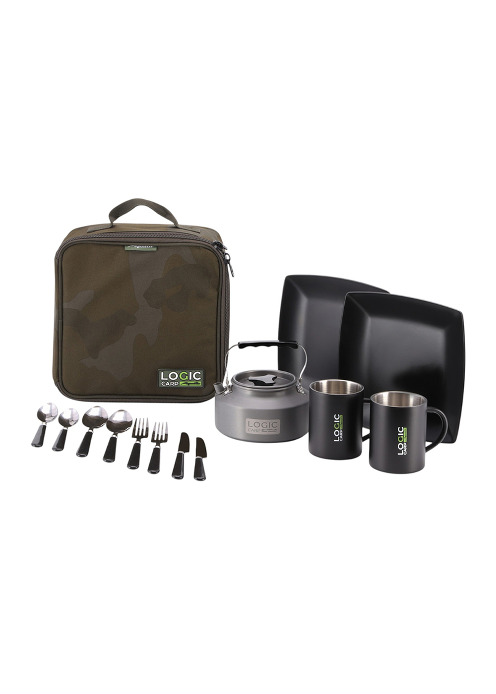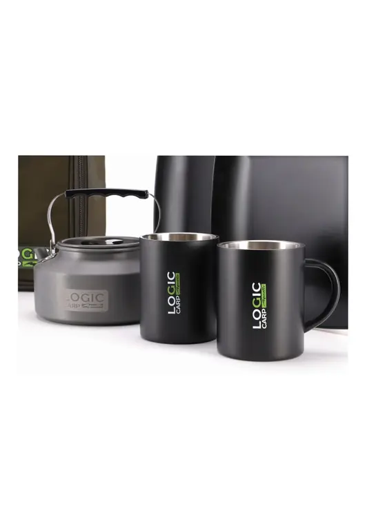 Набор посуды LOGIC CARP 2MAN MUGS & KETTLE DINNING SET — функциональный комплект для комфортного приёма пищи на природе на две персоны. В набор входит алюминиевый чайник объёмом 1,1 л, две изотермические кружки по 400 мл, две тарелки размером 22×22 см, столовые приборы (вилки, ложки, ножи) и специальный чехол для их хранения. Все предметы изготовлены из прочных материалов: кружки сохраняют тепло напитков благодаря двойным стенкам, тарелки не впитывают запахи, а приборы выполнены из нержавеющей стали. Комплект поставляется в удобной сумке-чехле размером 28×28×13,5 см, обеспечивающей компактное хранение и транспортировку. Набор идеально подходит для рыбалки, кемпинга и путешествий.