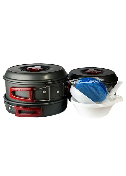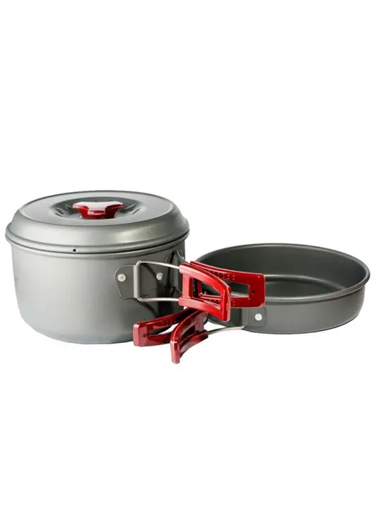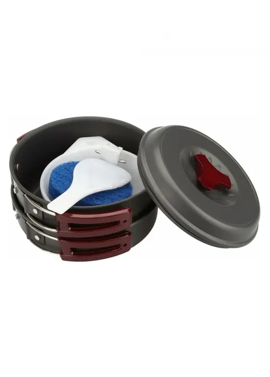 Набор посуды Tramp TRC-024 из анодированного алюминия включает котлы объёмом 1,75 и 1 литр, сковороду, поварешку, ложки и тарелки. Этот комплект идеально подходит для использования на природе, например, во время кемпинга или рыбалки. Ручки котлов и сковороды компактно складываются, а крышки специальной формы обеспечивают компактность хранения.
