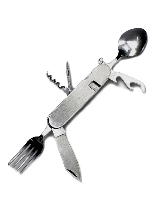 Многофункциональный походный мультитул незаменим на пикнике и рыбалке, во время путешествий или просто отдыха на природе. Все предметы легко выдвигаются и ими удобно пользоваться. Также можно разложить мультитул на две части, в результате чего получатся два отдельных столовых прибора.