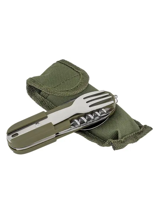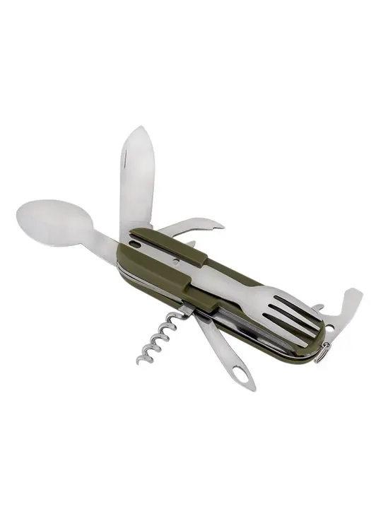 - Состав набора: Ложка, вилка, нож, штопор, открывашка для бутылок, открывашка для консервов, расширитель