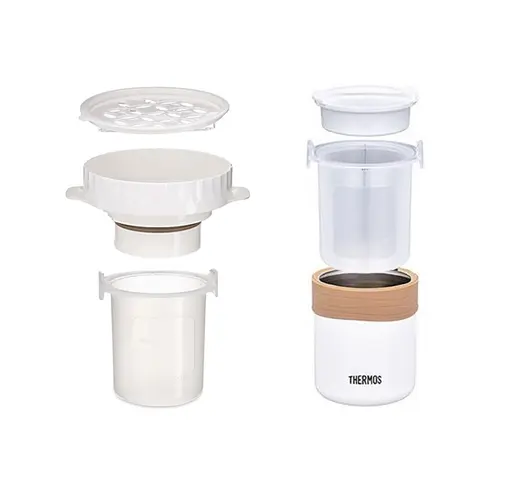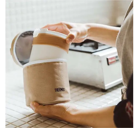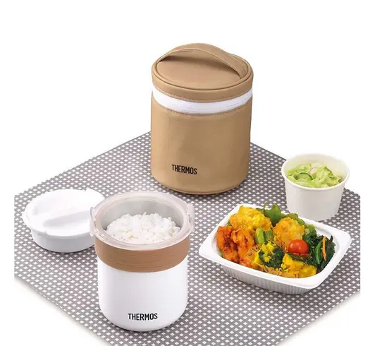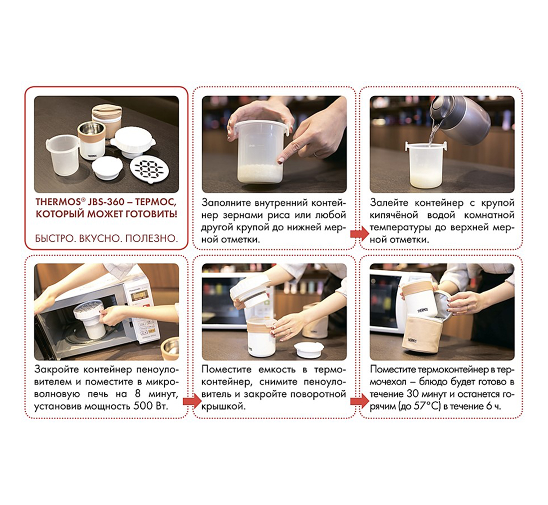 Термос-рисоварка THERMOS JBS-360 объемом 0.36L в нём можно готовить зерна практически без вашего участия - достаточно предварительно поместить внутреннюю ёмкость с рисом или другими зёрнами, залитыми водой, в микроволновую печь на 8 минут, затем накрыть крышкой и поставить в термоконтейнер. Через полчаса рис будет готов и сохранится горячим и вкусным в течение 6 часов. Крышка термоконтейнера не является абсолютно герметичной, поэтому термоконтейнер не рекомендуется использовать для транспортировки жидких горячих блюд. Объём 360 мл рассчитан на 1-2 порции (или 1-2 приёма пищи). В комплект входит термочехол, усиливающий теплоизоляционный эффект. Персональную рисоварку удобно использовать и в домашних условиях, предварительное замачивание риса не требуется - термос JBS максимально упрощает процесс его приготовления.