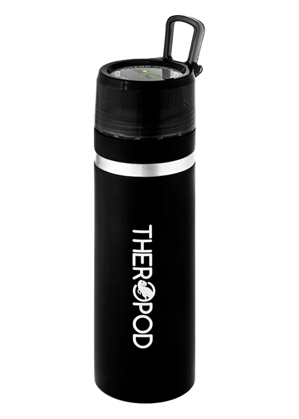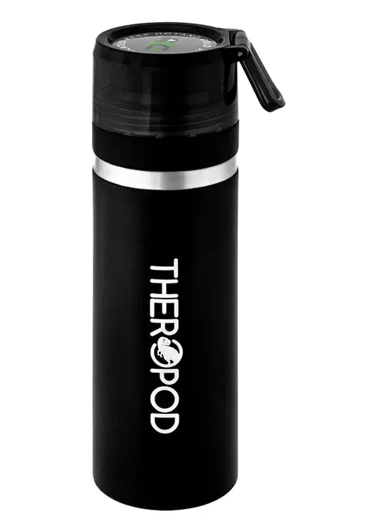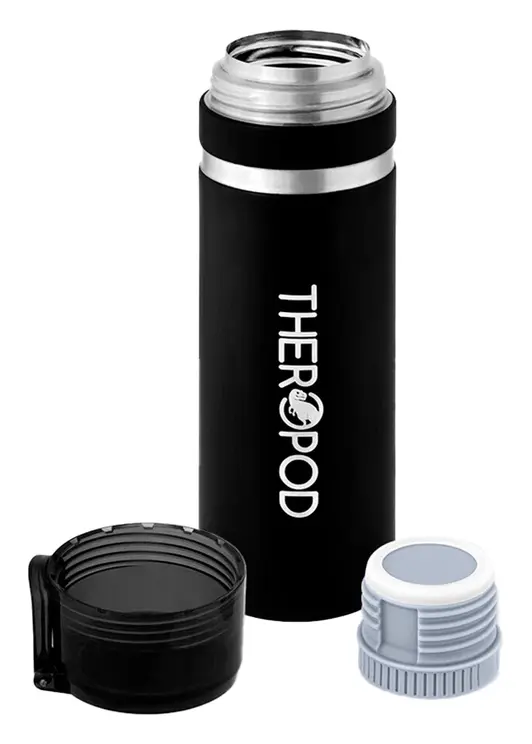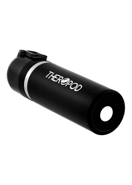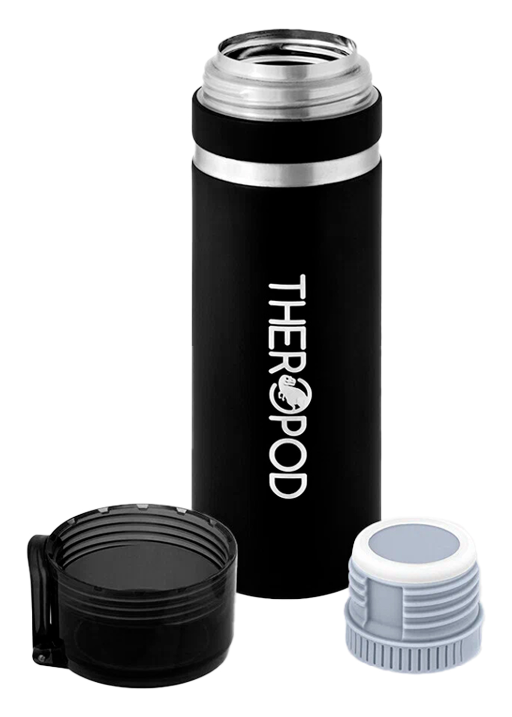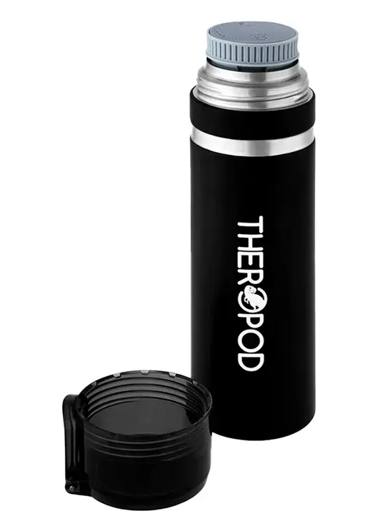 Термос для напитков THEROPOD TP-43 объёмом 0,7 литра выполнен из высококачественной нержавеющей стали и имеет чёрный цвет. Он эффективно сохраняет температуру напитка до 12 часов и весит 350 грамм. В комплект входит удобная крышка-чашка и винтовая пробка с силиконовым уплотнителем.