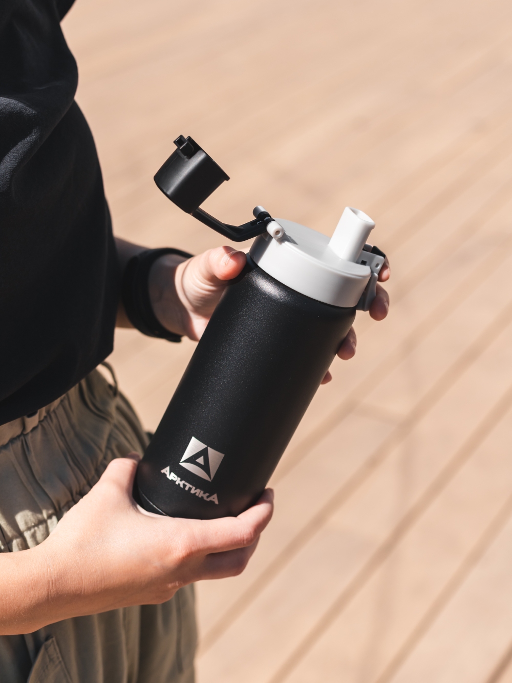 Специальный колпачок защищает носик для питья от пыли. Выполнен из долговечной пищевой нержавеющей стали.